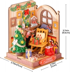 Ce kit DIY détaillé apporte le charme de Noël à tout intérieur. Au-dessus de la cheminée, un calendrier affiche la date du 25 décembre, des guirlandes et une couronne scintillent tout autour, une bougie brûle et des cadeaux attendent sous le sapin. La scène est complétée par un fauteuil à bascule pour grand-père, des photos aux murs, des douceurs et un chat se reposant près de la fenêtre.