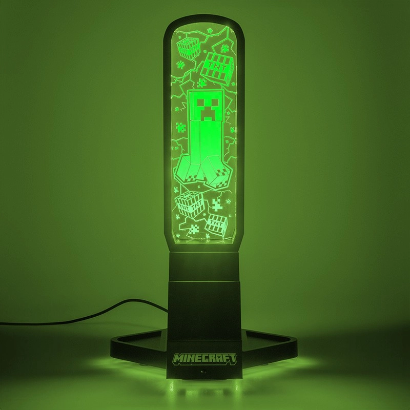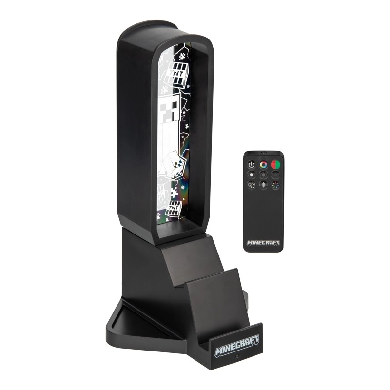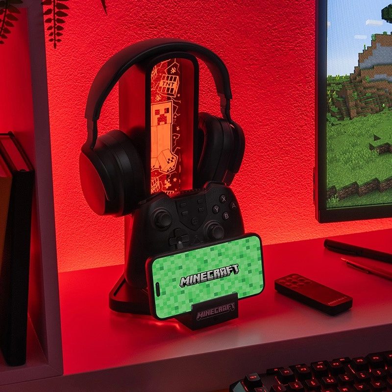Apportez de l’ambiance à votre coin gaming avec ce support pour casque au style Minecraft. Sa hauteur de 30 cm offre un rangement stable pour la plupart des casques, tandis que le support de téléphone intégré garde votre mobile à portée de main. Plusieurs modes d’éclairage créent des effets lumineux uniques pour le jeu comme pour le travail.