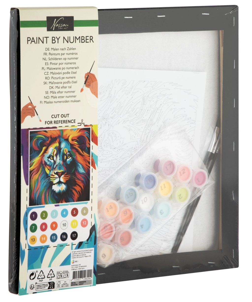 Ce kit créatif représentant un lion majestueux sur toile noire est un excellent choix pour les enfants comme pour les adultes souhaitant créer sans préparation complexe. Le fond noir contrasté met en valeur les couleurs et le résultat final ressemble à une véritable œuvre d’art. Il suffit de suivre les numéros et d’observer comment le motif se transforme étape par étape en tableau terminé.
