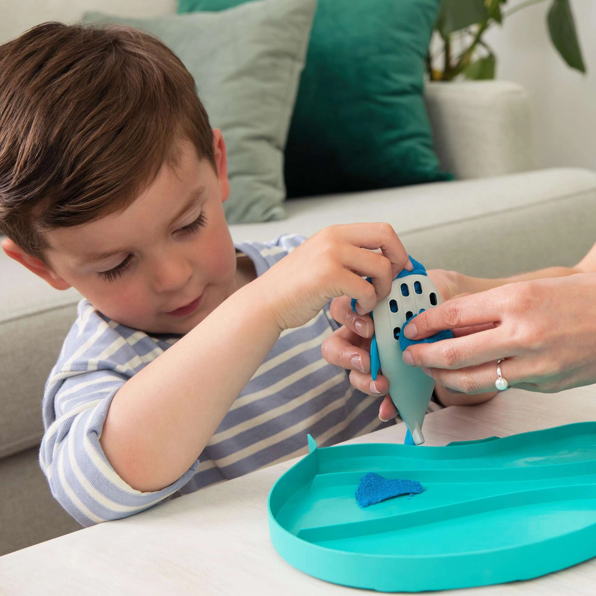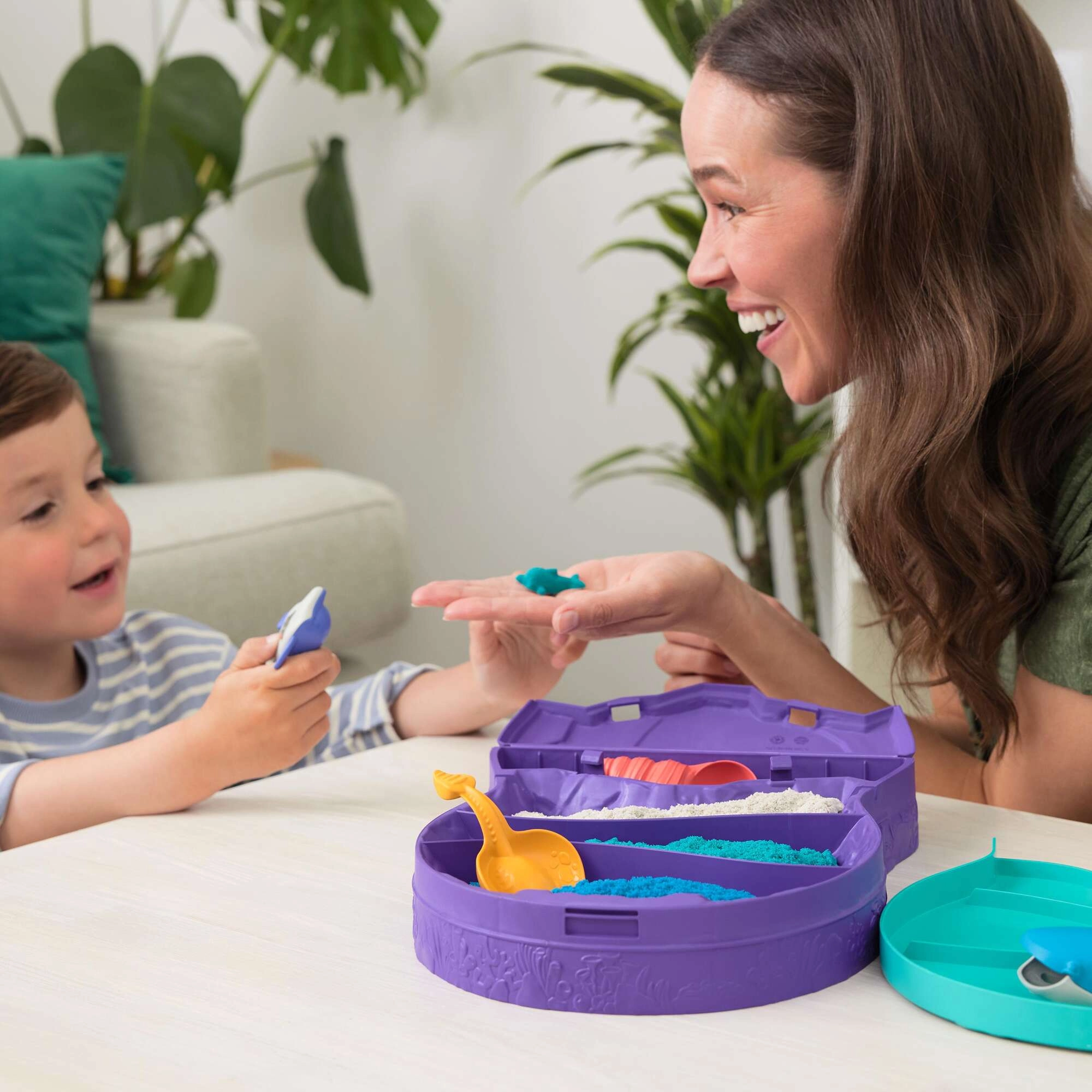 Le sable cinétique Kinetic Sand reproduit la sensation du sable mouillé, sans salissures ni dessèchement. Les enfants peuvent facilement modeler, couper, presser et construire tout en entraînant leur coordination et leur créativité. Le set Deep Sea propose une combinaison de bleu, blanc et vert pour créer des scènes et des formes sous-marines amusantes.