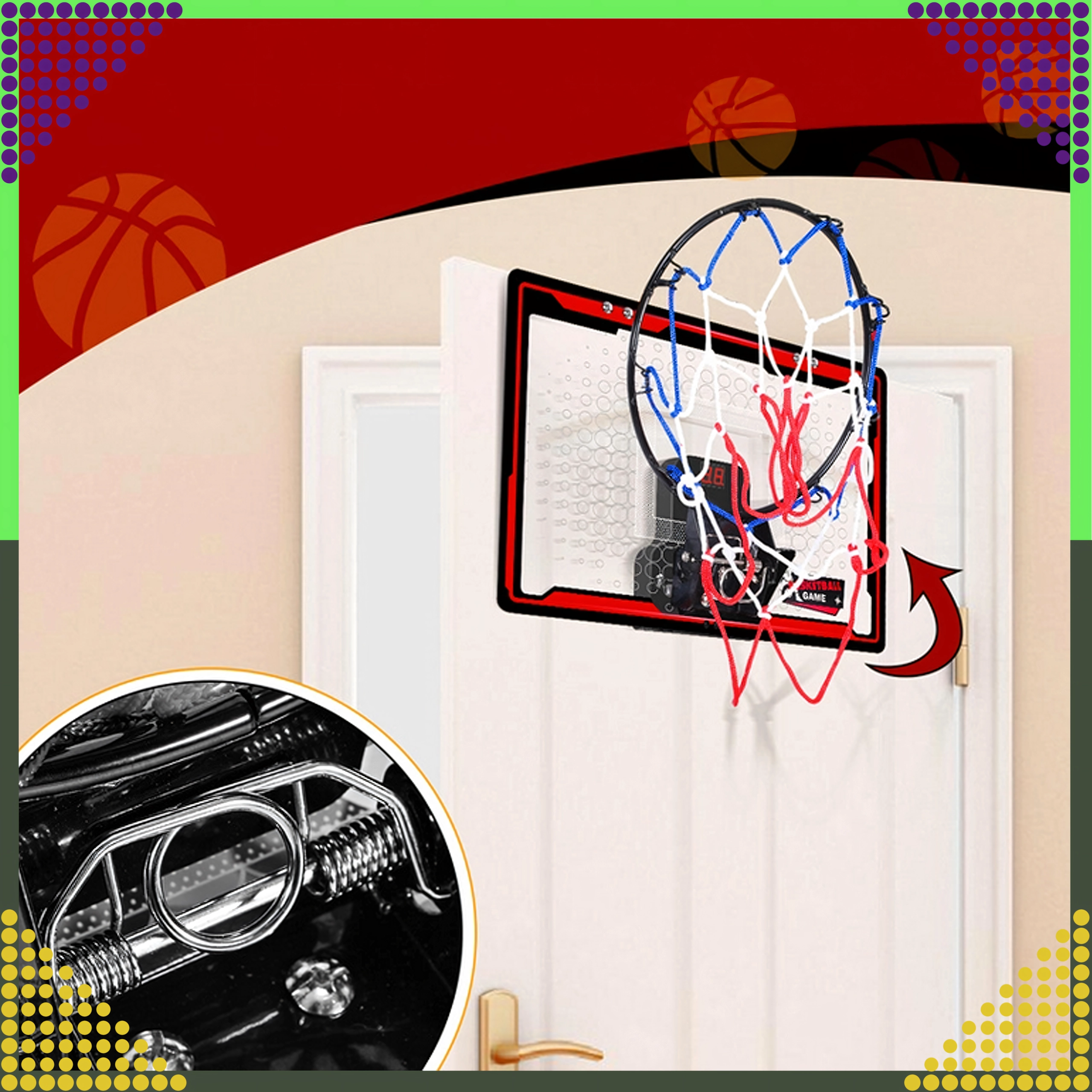 Grâce à sa fixation universelle, vous l’installez facilement sur une porte, un mur ou une structure de lit. Le cercle à ressort amortit mieux les impacts lors des dunks et préserve la planche ainsi que la fixation. Le set est parfait pour les enfants, mais divertira aussi les adultes pendant une courte pause.