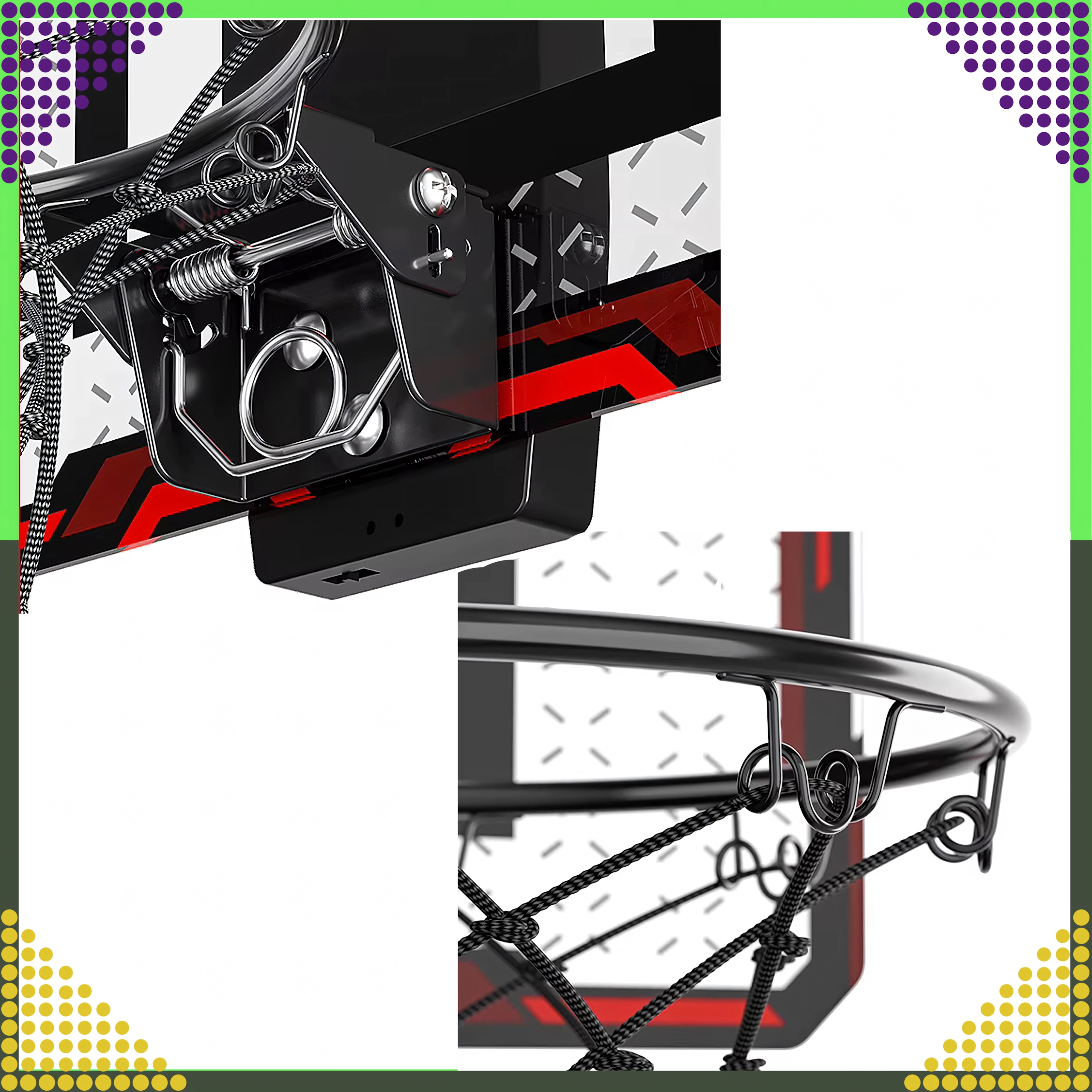 Le mécanisme à ressort absorbe les impacts à l’atterrissage du ballon et protège la structure. Le filet est tressé pour une longue durée de vie et un rebond fluide.