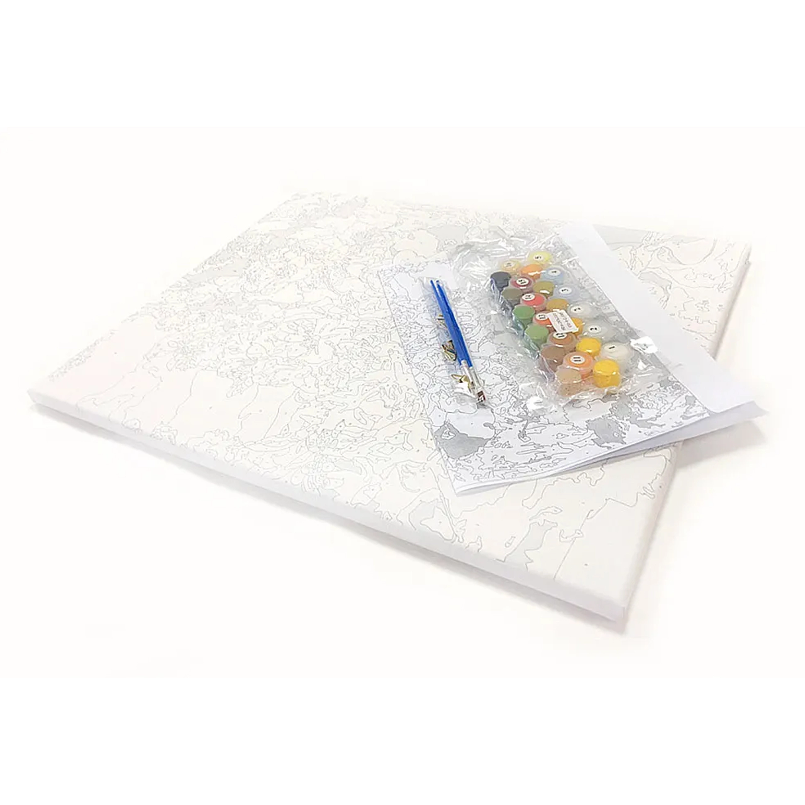 La boîte contient tout le nécessaire : toile préimprimée, set de peintures en godets, pinceaux et modèle de référence pour un résultat sûr.