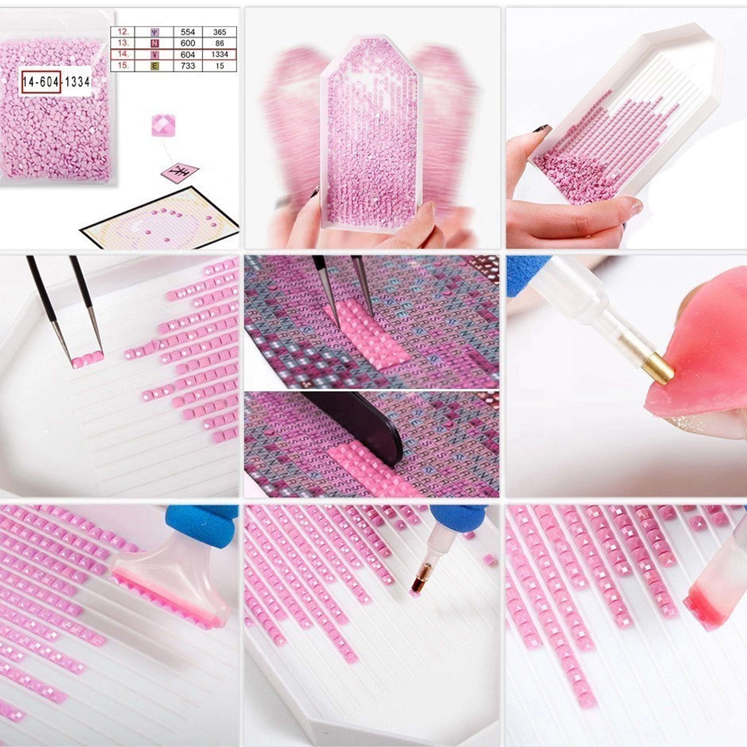 Tout le nécessaire est inclus : toile autocollante 21 × 25 cm, strass en résine de nombreuses couleurs, applicateur avec cire pour une prise précise et plateau rainuré pour aligner facilement les “drills”. Le kit est parfait pour les déb u tants et favorise la motricité fine, la concentration et la patience.