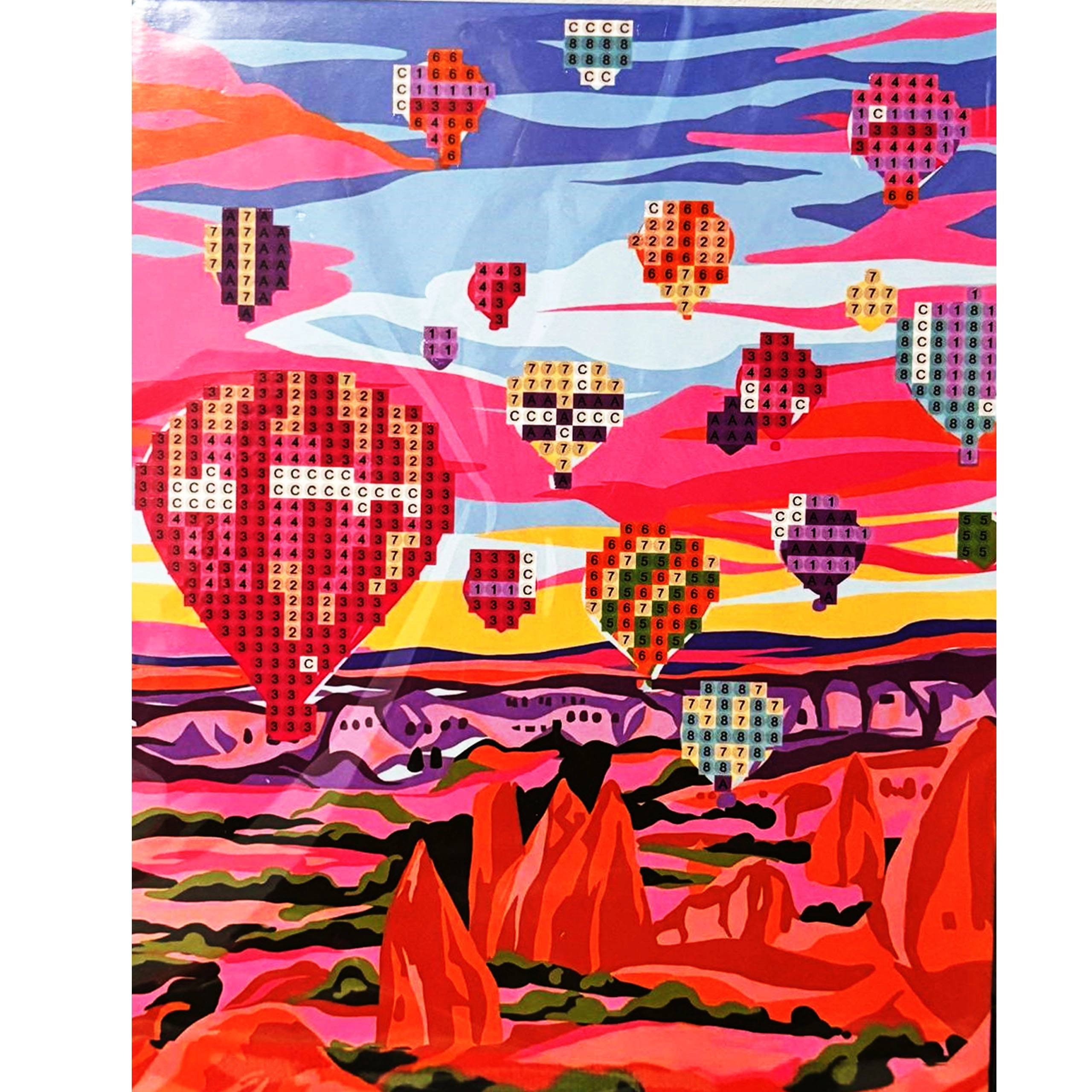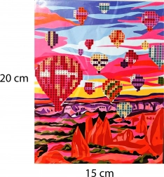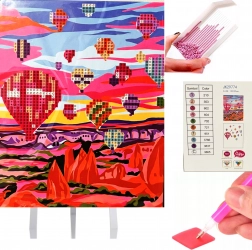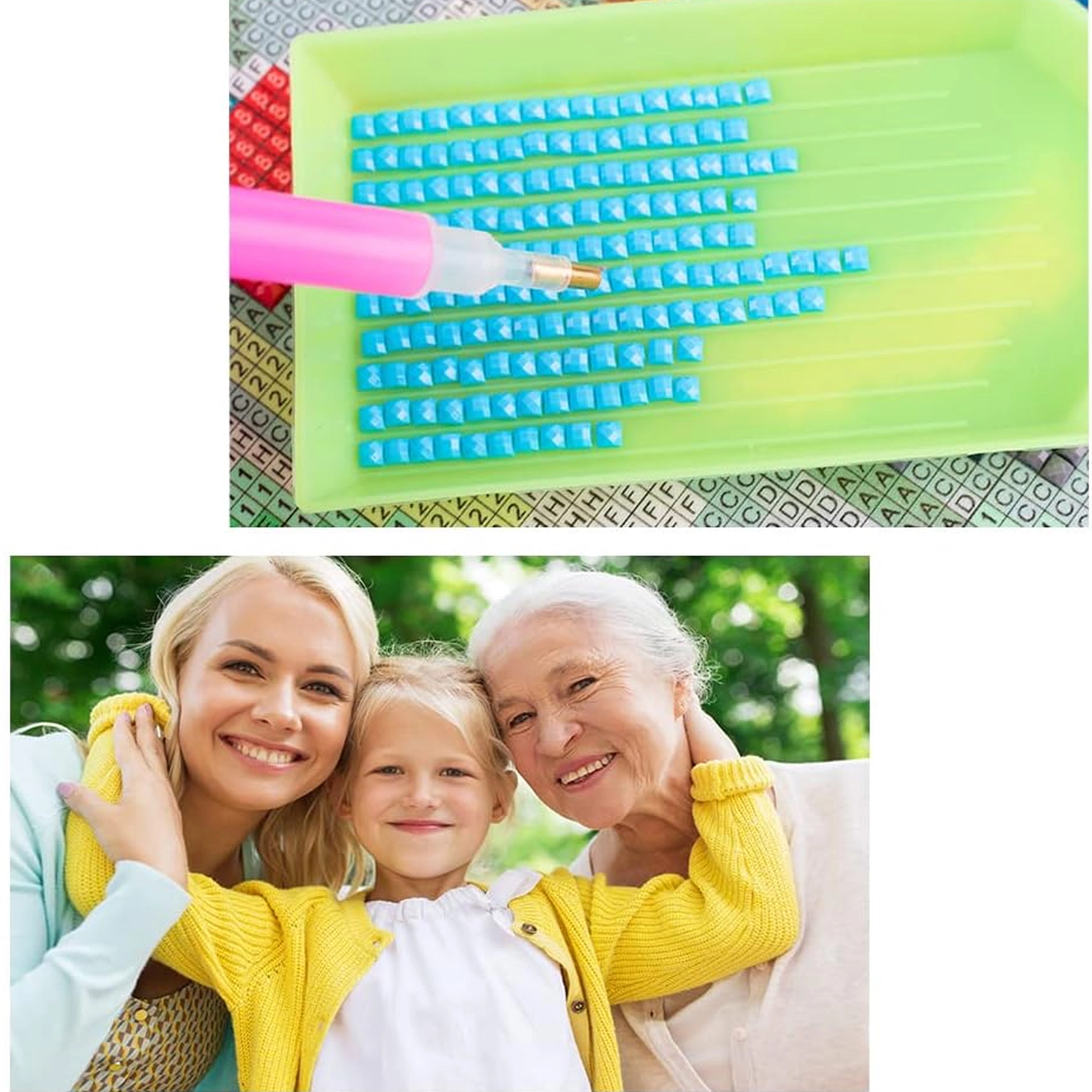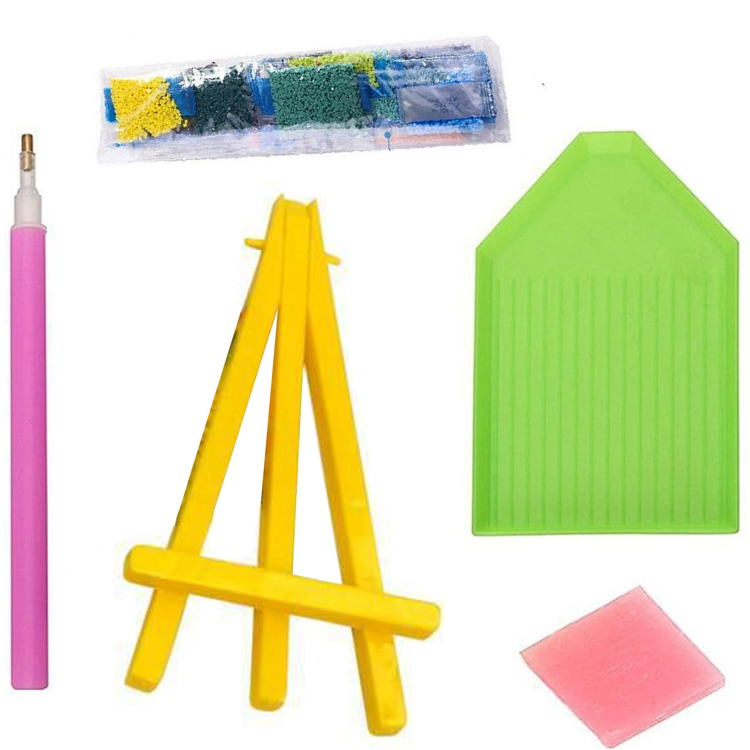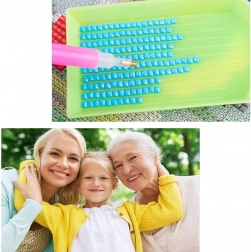 La procédure est simple : versez les strass dans le plateau rainuré, saisissez-les avec l’applicateur enduit de cire et collez-les sur la toile préimprimée selon le code. Grâce au marquage clair, le projet est idéal pour les enfants et grands débutants.