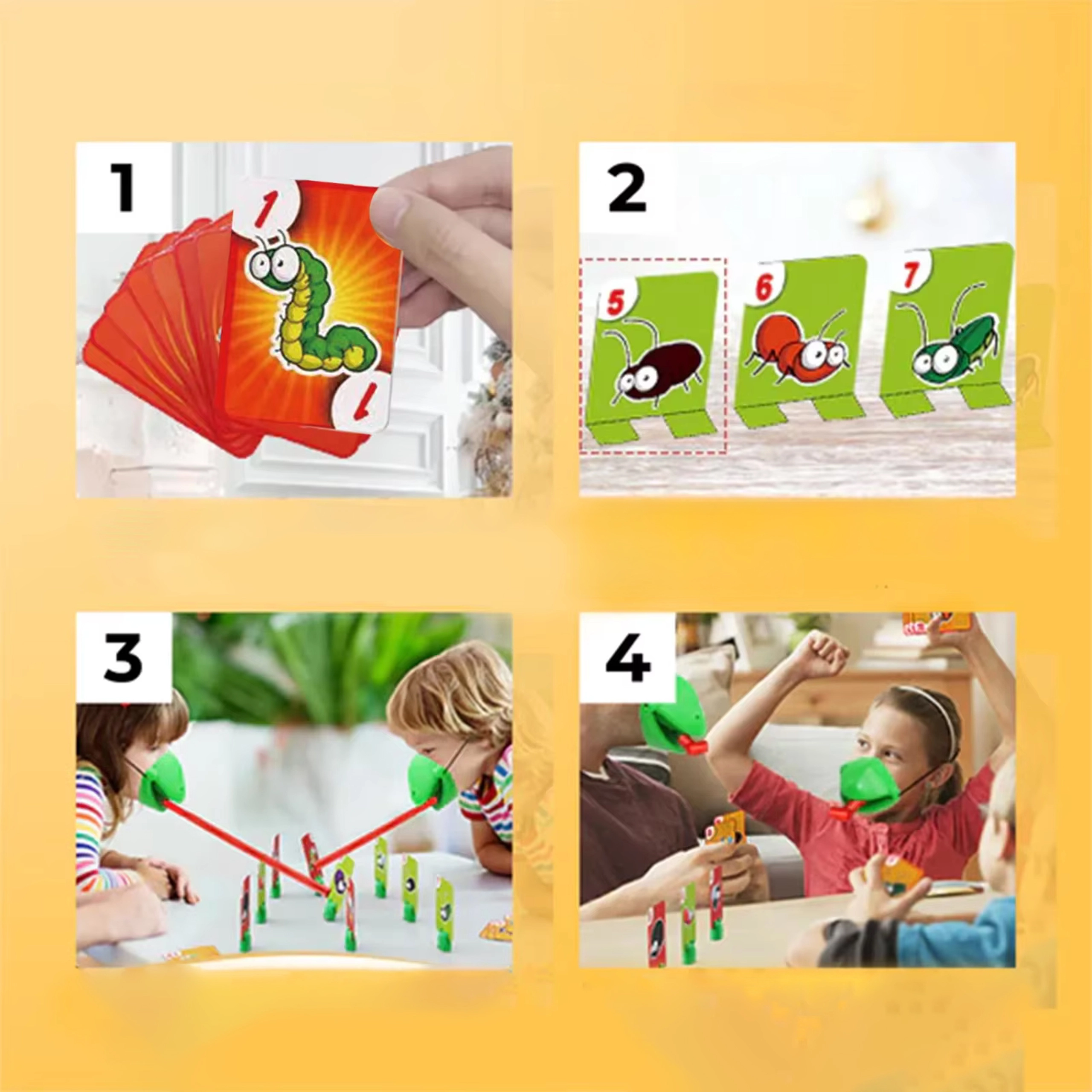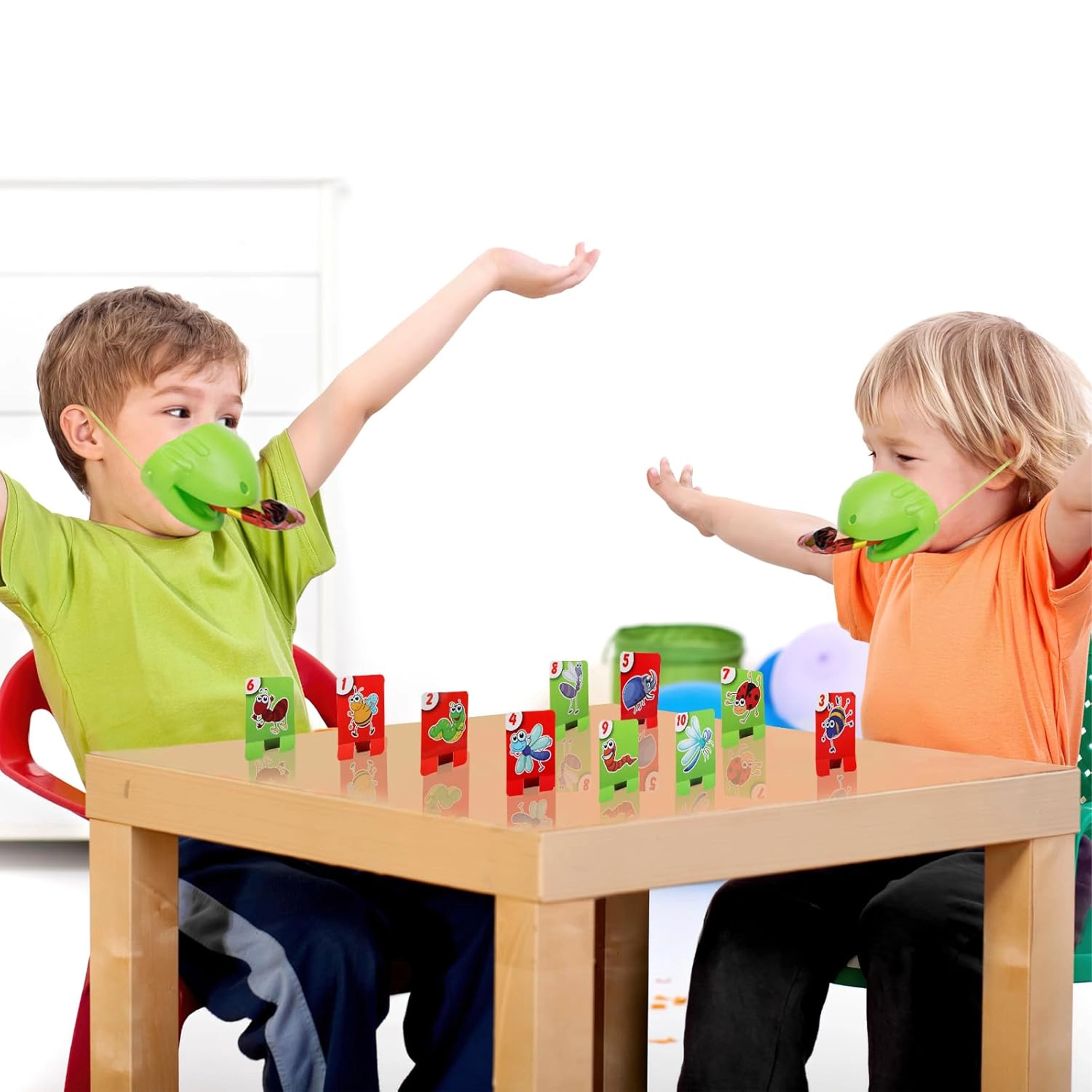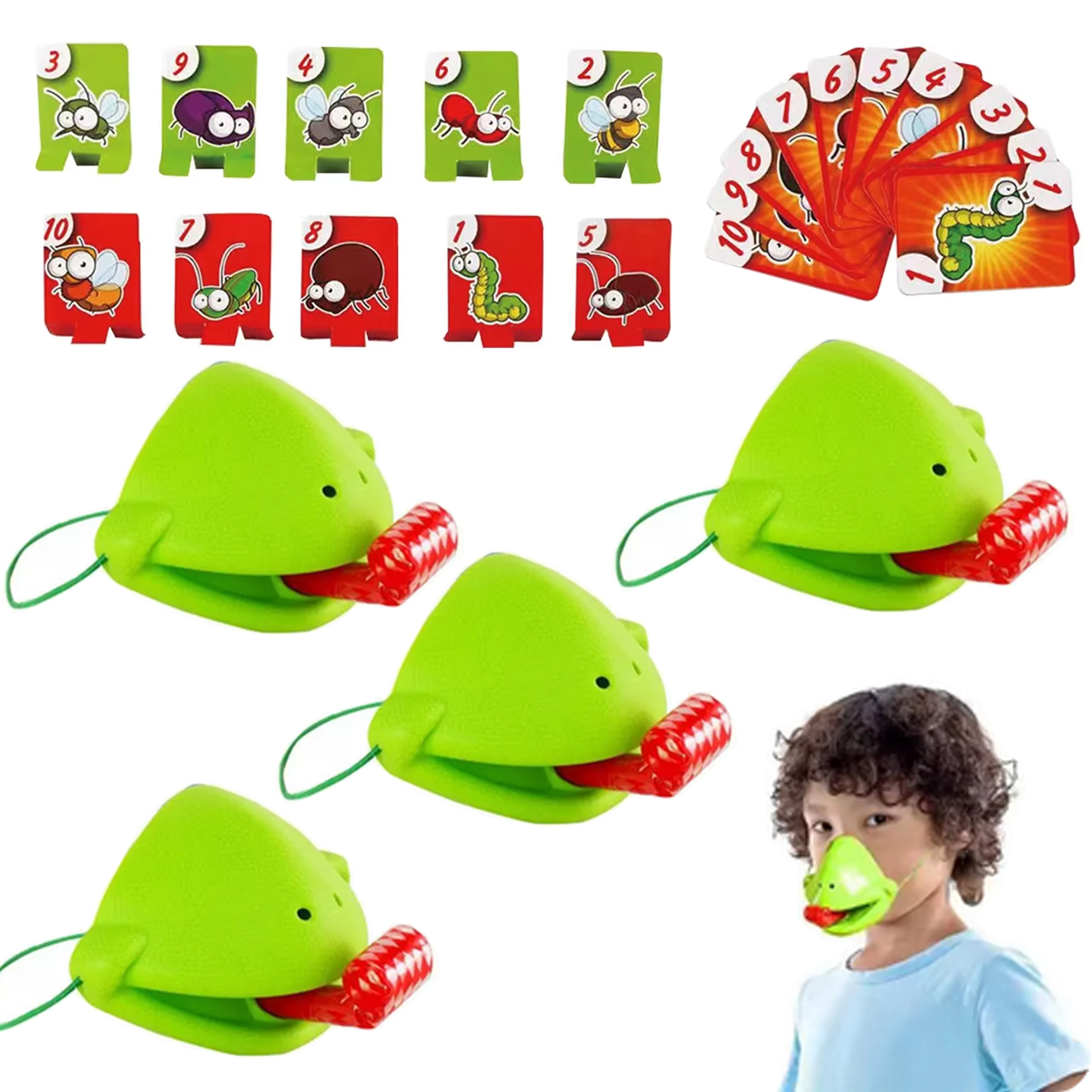Le set comprend tout pour 4 joueurs : masques de grenouille légers avec bande élastique et « langue », et des cartes colorées. Le jeu favorise les réactions rapides, la coordination œil–main et la concentration. Idéal pour les soirées en famille, les fêtes d’enfants et les moments libres à la maison.
