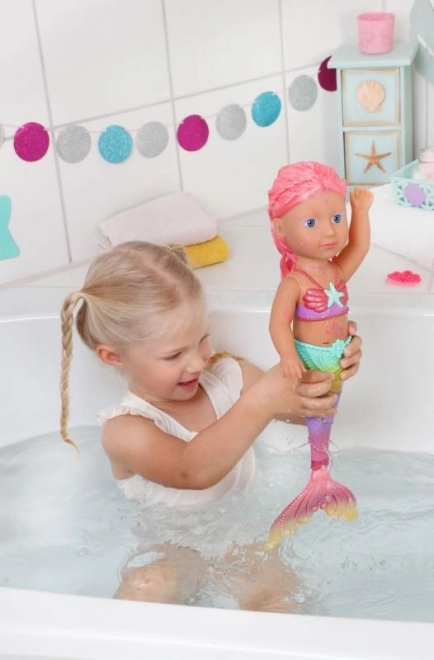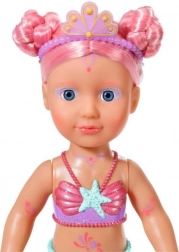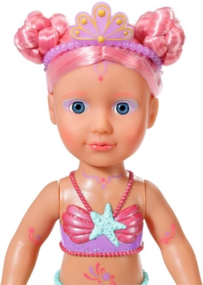 BABY born Petite princesse sirène est une poupée irrésistible avec de longs cheveux roses ornés d'un serre-tête violet. La queue de la poupée est magnifiquement colorée, scintillante et elle bouge au contact de l'eau, créant une atmosphère magique. Elle porte un maillot de bain à motif de coquillages qui s'harmonise parfaitement avec sa queue.