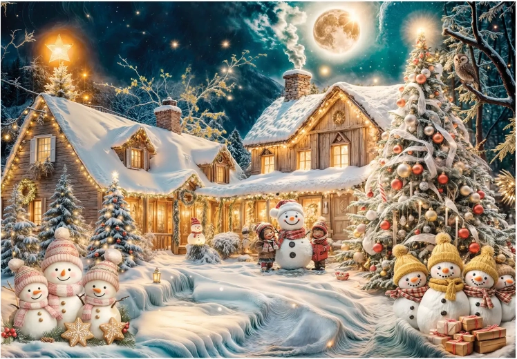 L’image finie a des dimensions pratiques de 48 × 33 cm, ce qui convient à la plupart des tables et des cadres. L’impression de qualité garantit des couleurs vives et des détails nets, mettant en valeur chaque élément de l’ambiance hivernale.