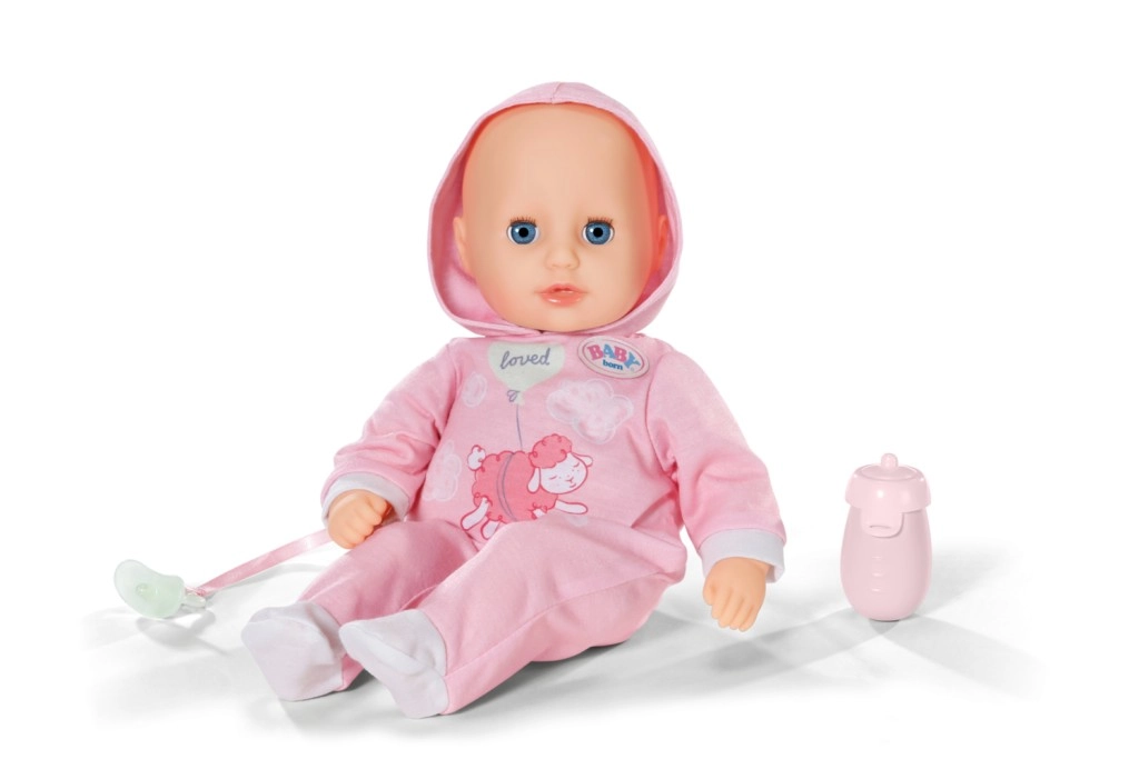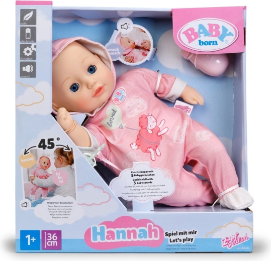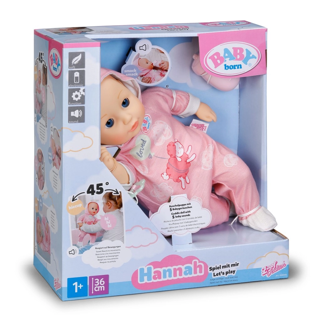 Adorable poupée BABY born Hannah de 36 cm, la camarade idéale pour jouer et câliner au quotidien. Elle offre un corps souple en tissu, des sons de bébé réalistes, sait boire au biberon avec des sons de succion, ferme les yeux et émet de douces sonorités apaisantes au moment du dodo. Le coffret comprend une tétine et un biberon.