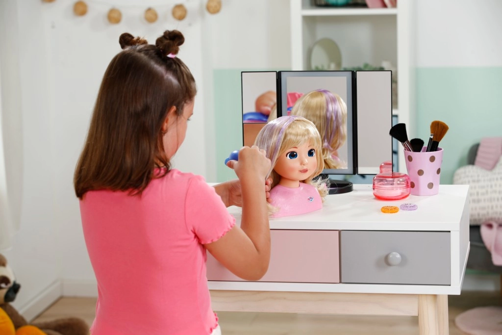 Le socle solide maintient la tête en place lors du coiffage sur une table ou une coiffeuse – convient aux enfants dès 3 ans.