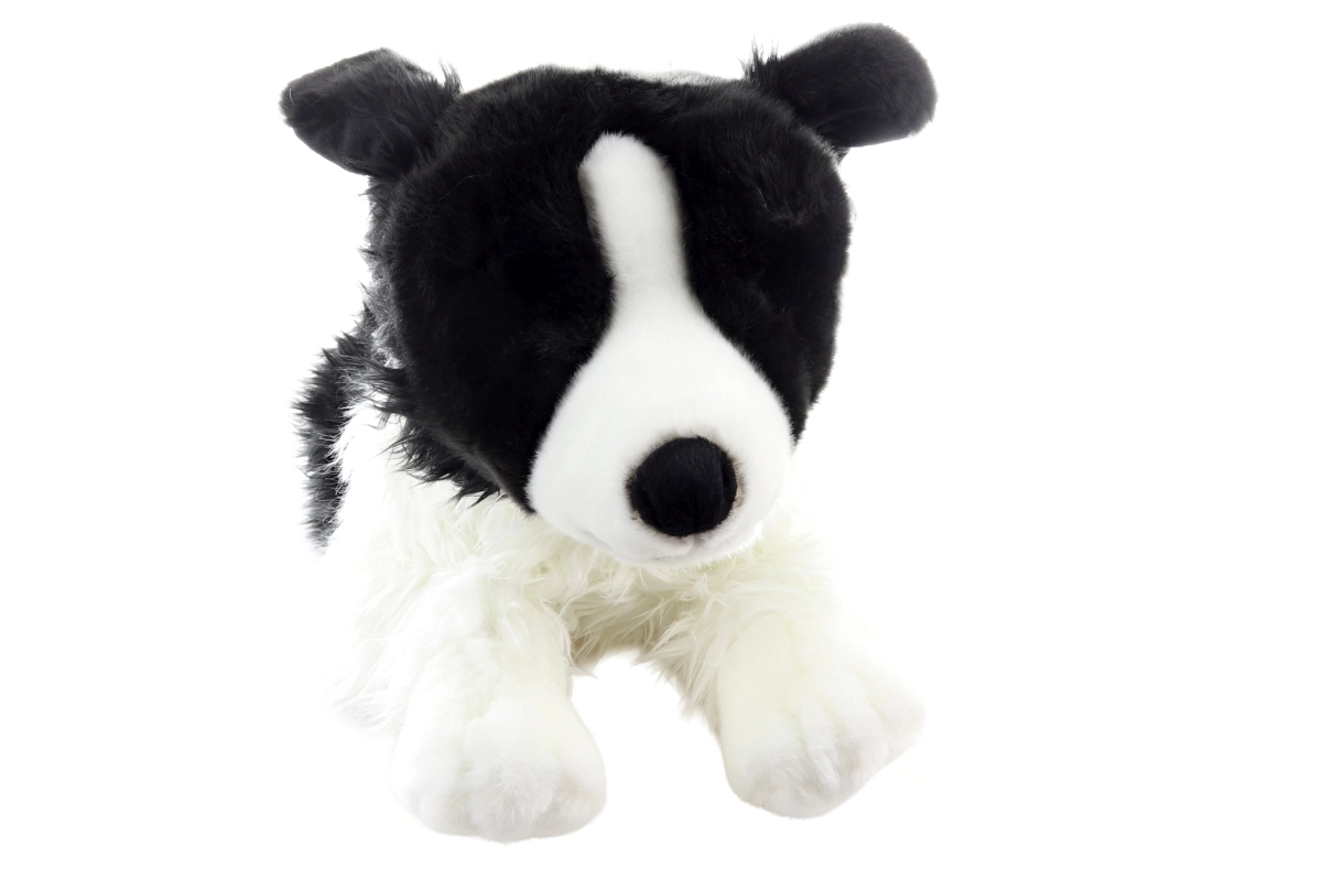 Ce grand chien en peluche Border Collie en position allongée séduit dès le premier toucher. Il est fabriqué dans un matériau très doux et agréable au toucher, invitant aux câlins. La combinaison réaliste de fourrure noire et blanche et ses oreilles mignonnes donnent au jouet une apparence authentique.