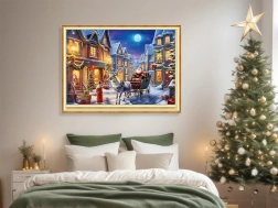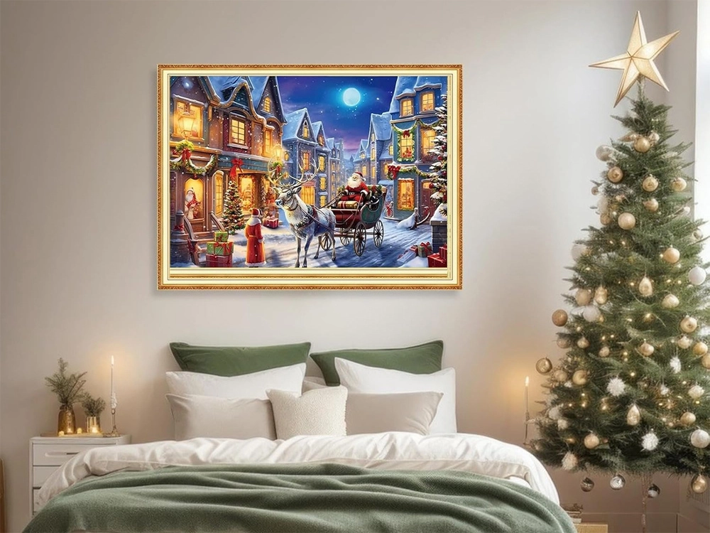 L’image finale de 70 × 50 cm montre le PÈRE NOËL en traîneau, un renne et un village d’hiver – une décoration de saison idéale.