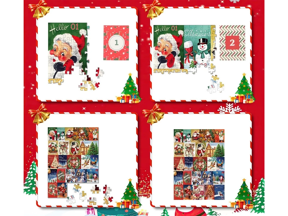 Découvrez la magie de Noël avec ce calendrier de l’Avent original, qui renferme 24 puzzles individuels aux motifs de Noël, de Saint-Nicolas et d’ambiance hivernale. Chaque fenêtre contient 42 pièces qui, une fois tous les jours assemblés, forment une grande image de 70 × 50 cm. Divertissement idéal pour enfants et adultes, carton de qualité, dos numérotés pour un tri facile et style VINTAGE pour une atmosphère festive et nostalgique.