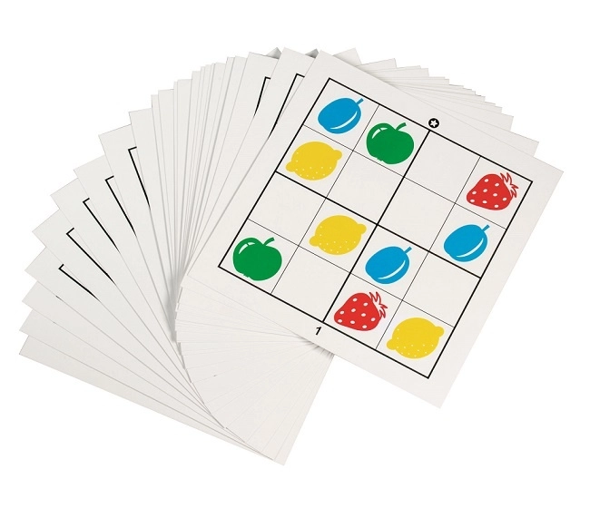 Cette version astucieuse du sudoku pour les plus petits propose des règles simples et beaucoup de plaisir. Les enfants complètent les cases vides de la grille 4×4 afin que les mêmes images ne se répètent pas dans la ligne, la colonne ni les carrés – comme dans le sudoku classique, mais avec de joyeux motifs de fruits.