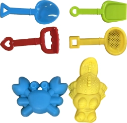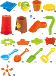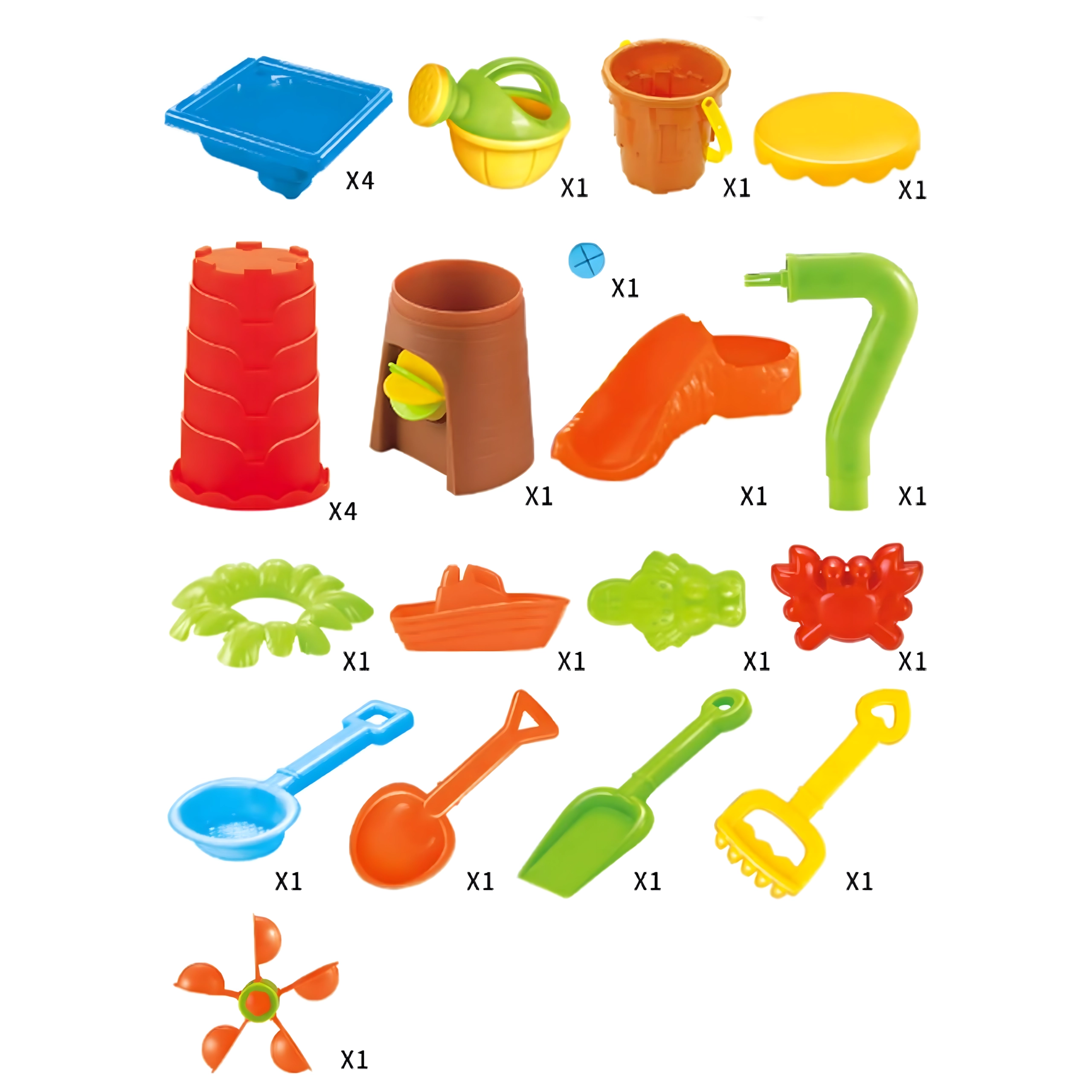 - Arrosoir, pelles, râteau, tamis, moules, gobelets, toboggan, tabouret, table à compartiments multiples