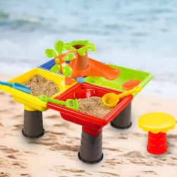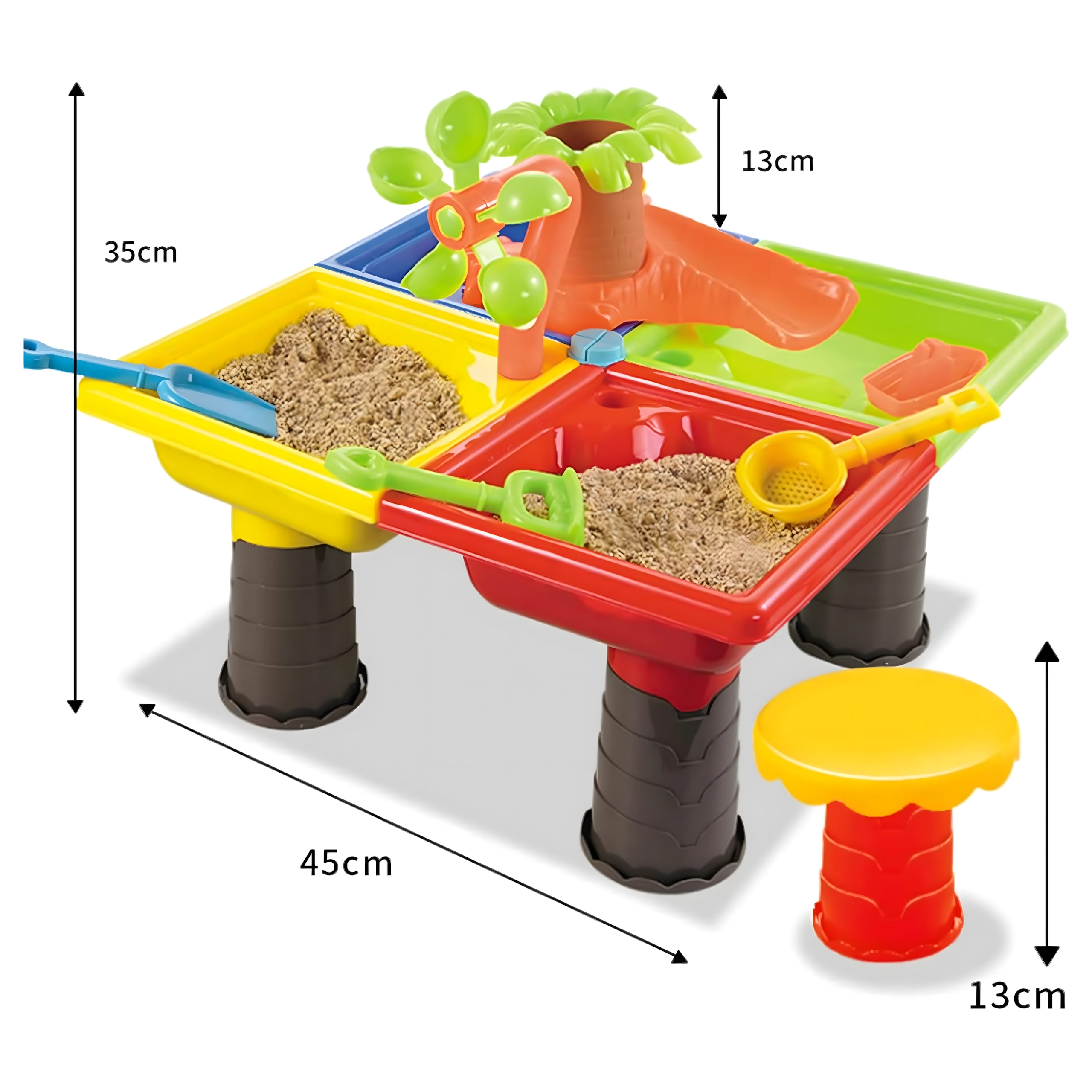 Accessoires inclus : arrosoir, pelles, râteau, tamis, moules, gobelets, toboggan et tabouret. Les enfants peuvent ramasser, transvaser, tamiser et créer des formes, ce qui développe la motricité fine, la coordination œil-main et l’imagination.