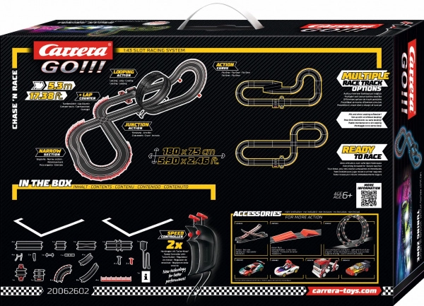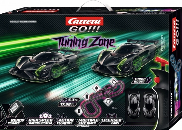 Le circuit CARRERA GO Tuning Zone apporte des sensations fortes sur une piste de course à la maison. Sur 5,3 mètres, profitez d’une combinaison variée d’éléments : looping, mur vertical, carrefour, rétrécissement, longues lignes droites rapides et virages techniques. Deux hypercars finement détaillées à l’échelle 1:43 sont prêtes pour l’affrontement, tandis que les manettes avec fonction Turbo poussent la vitesse au maximum.