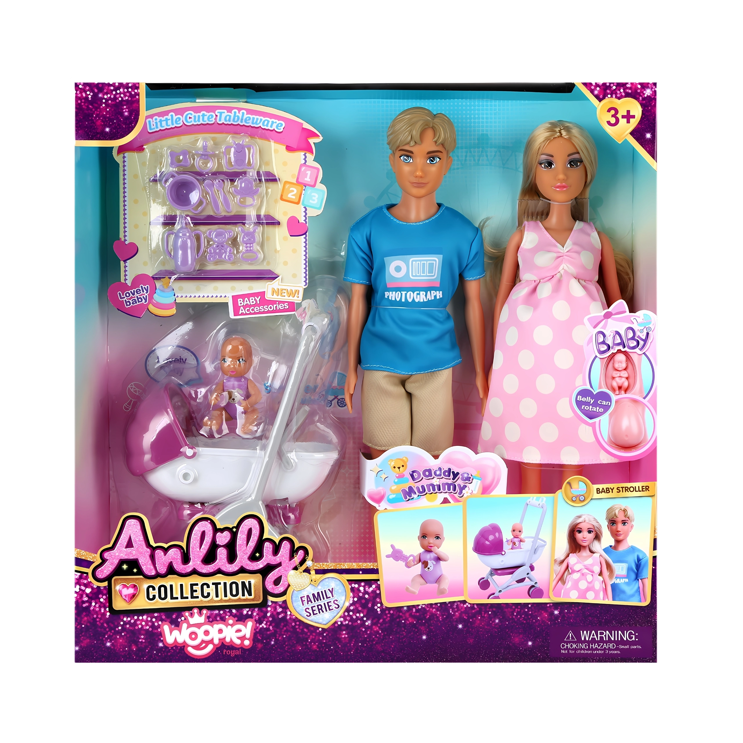 - Maman enceinte avec bébé amovible, papa, bébé, poussette, accessoires (biberon, bol, tétine, couches, peigne, petite assiette)