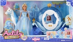 - Poupée princesse, cheval, carrosse, couronne, sac à main, collier