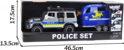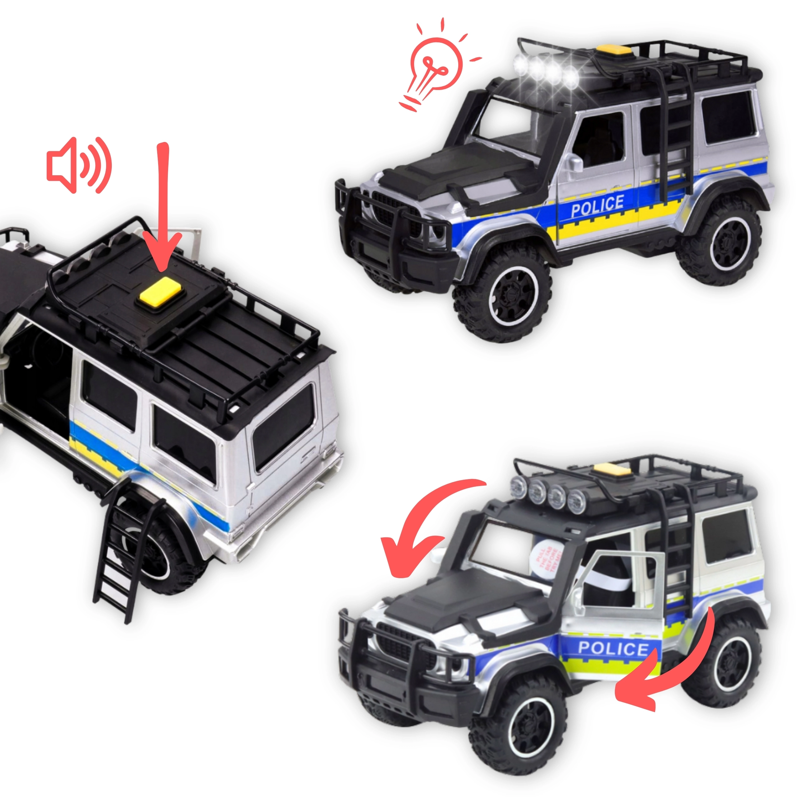 Partez en intervention avec l'ensemble voiture de police tout-terrain avec remorque détachable pour cheval de la marque WOOPIE. Des effets lumineux et sonores réalistes, des portes ouvrantes et une finition détaillée dans une combinaison noir-bleu garantissent un jeu captivant et créatif. Des piles sont également incluses pour jouer immédiatement.