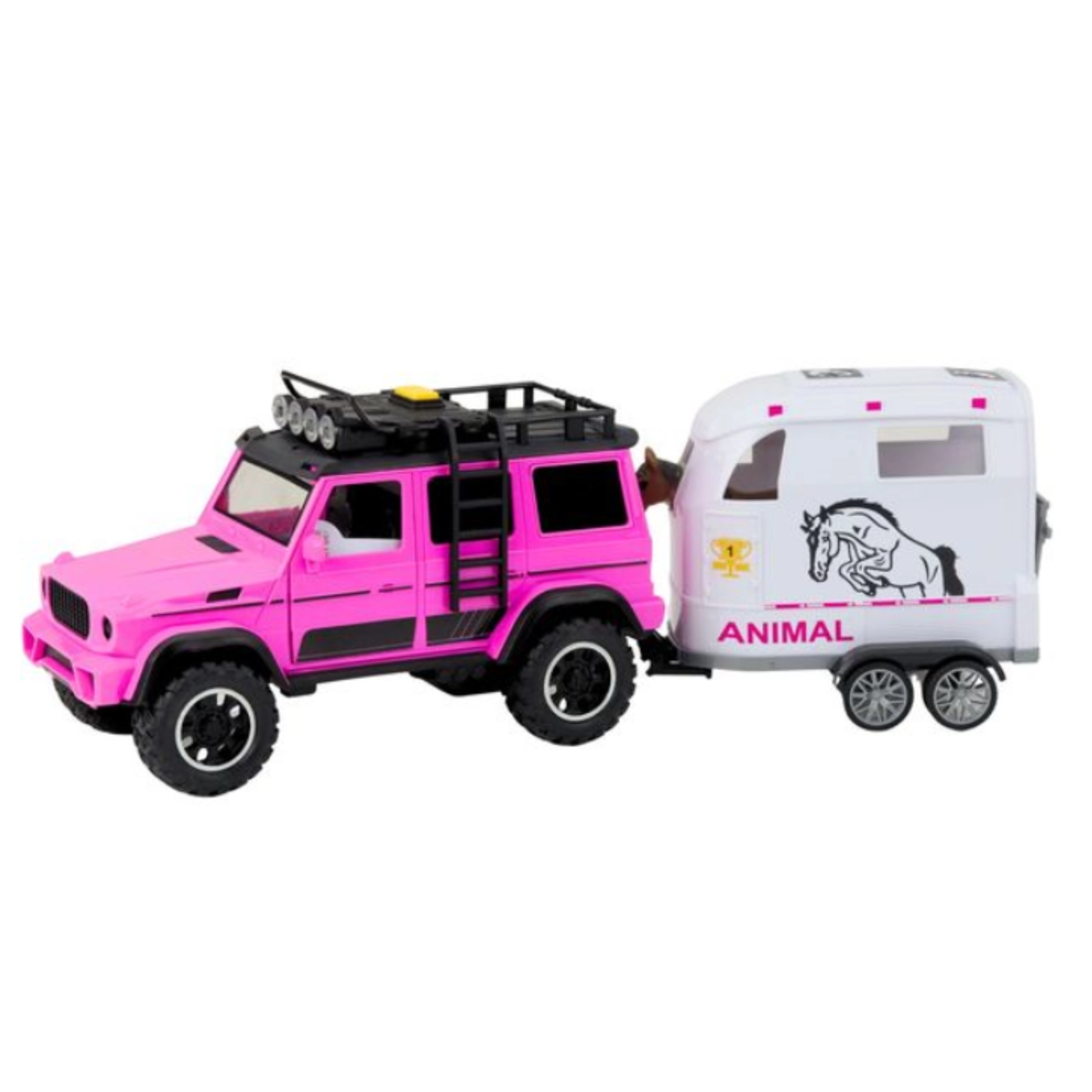 Ce set soigneusement détaillé est idéal pour les petits amoureux des animaux et des véhicules tout-terrain. La combinaison de couleurs rose et blanc attire immédiatement l’œil, et les éléments interactifs comme les lumières, les sons et les portes ouvrantes offrent une expérience de jeu authentique. Grâce à la remorque amovible, les enfants peuvent jouer séparément avec la voiture, la remorque et le cheval, stimulant ainsi leur imagination.
