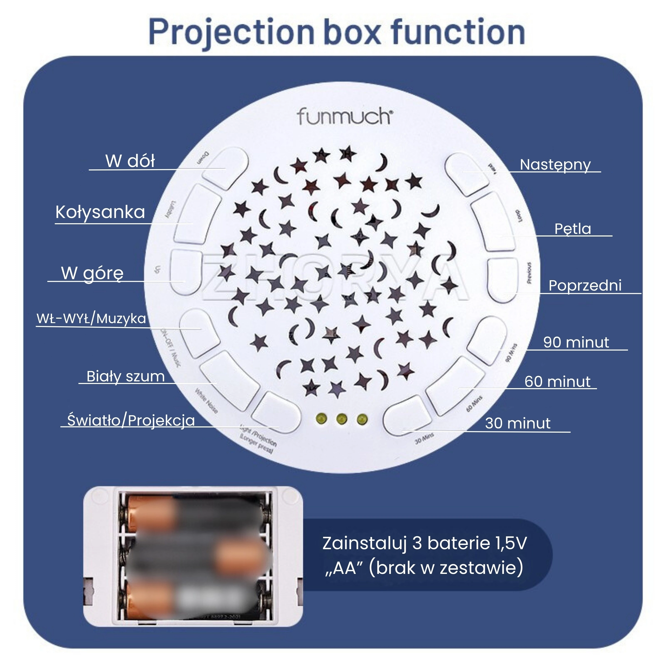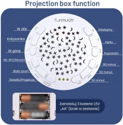 Le jouet est fabriqué en peluche très douce et sûre, adaptée dès la naissance. Agréable au toucher, il deviendra le compagnon préféré de bébé, non seulement pour la nuit mais aussi pendant la journée. L’alimentation est assurée par des piles AA standard (non incluses), pour l’emporter partout.