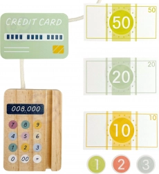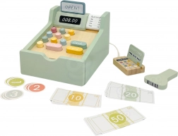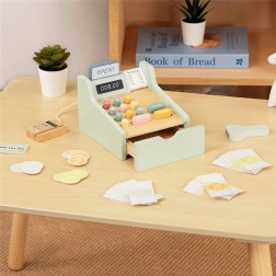 Le set contient tout ce dont un petit vendeur a besoin : une caisse en bois avec boutons colorés, un scanner, un lecteur de cartes, une carte de paiement, des pièces et des billets. Le jeu développe la pensée logique, les compétences mathématiques, les capacités de coordination ainsi que la communication lors des jeux de rôle entre vendeur et client.
