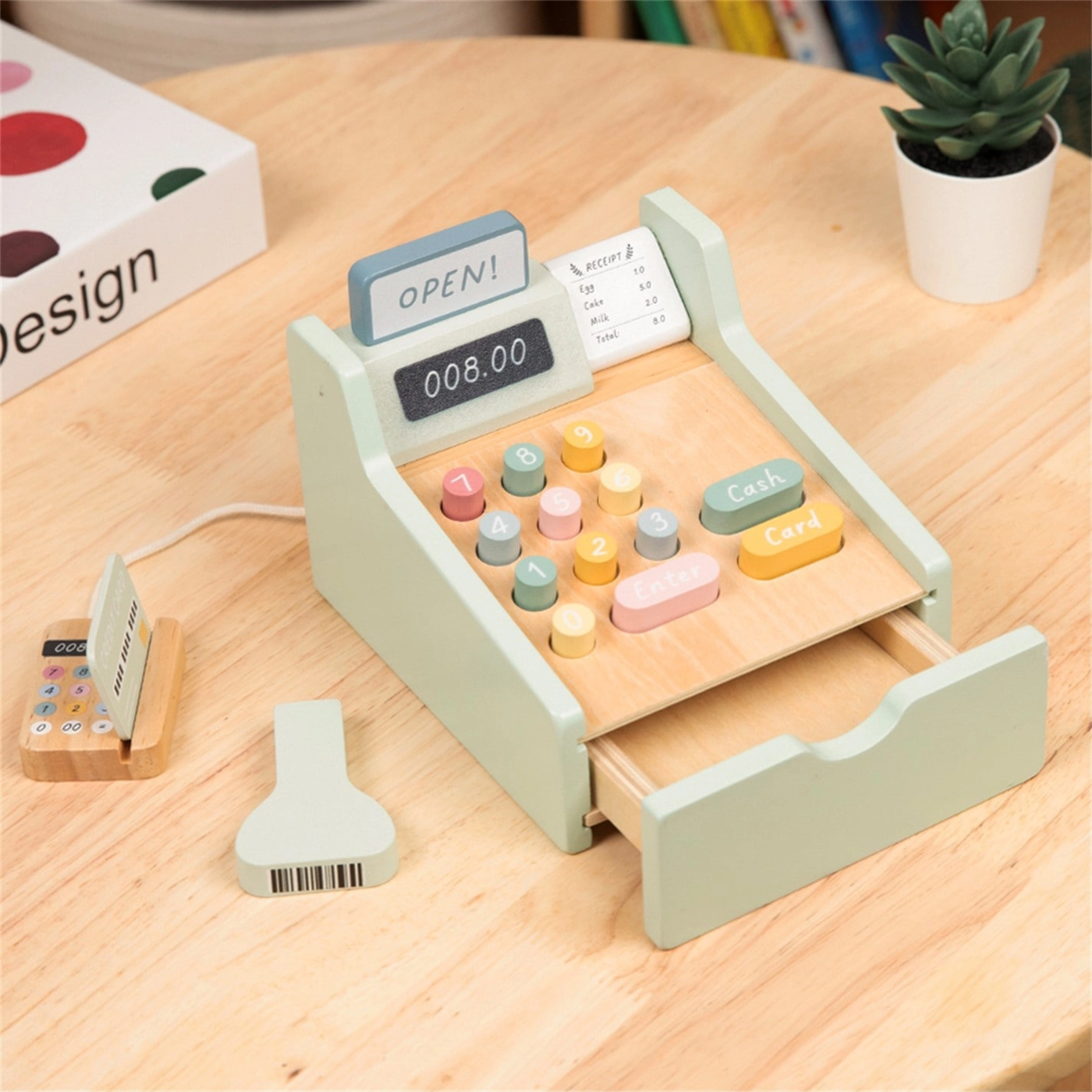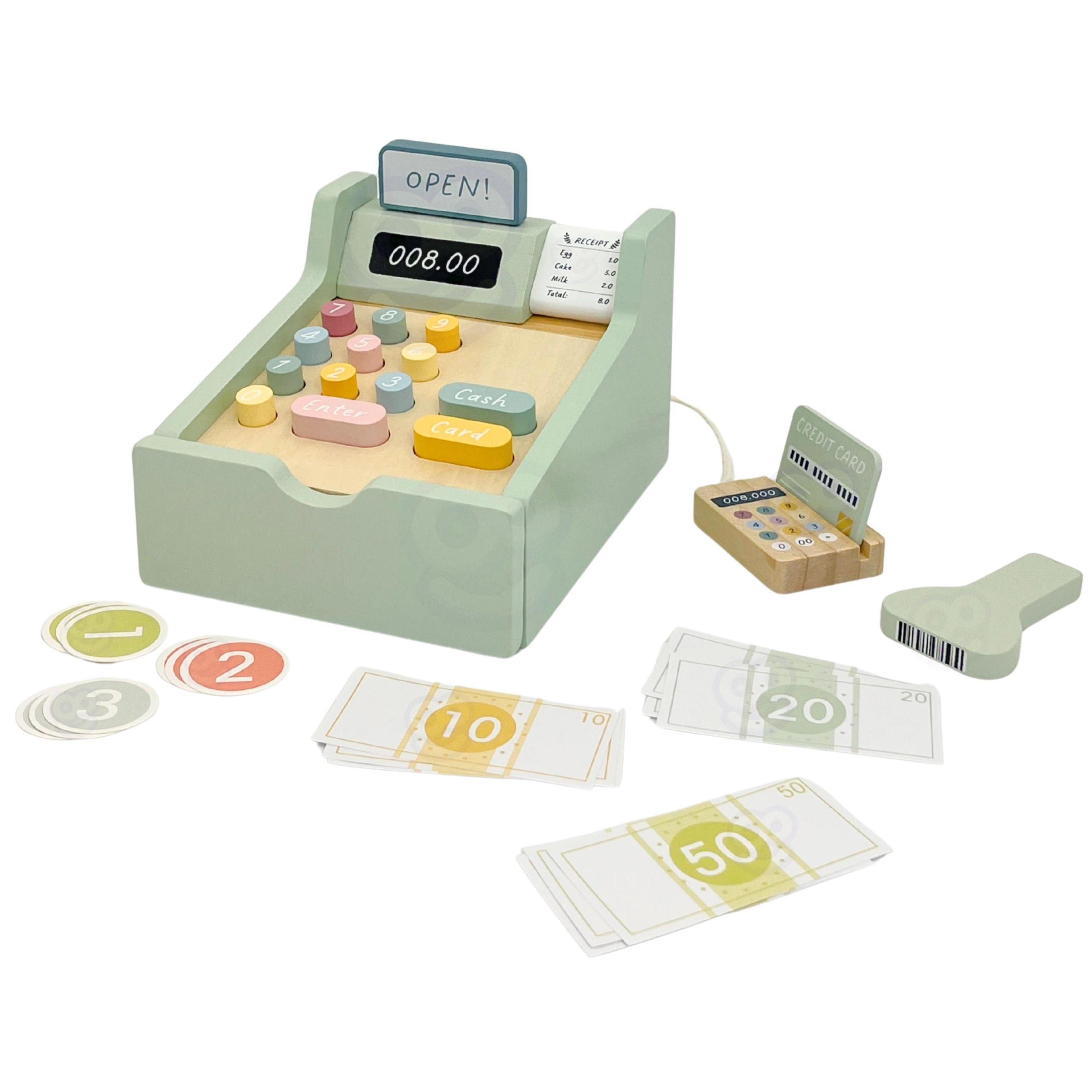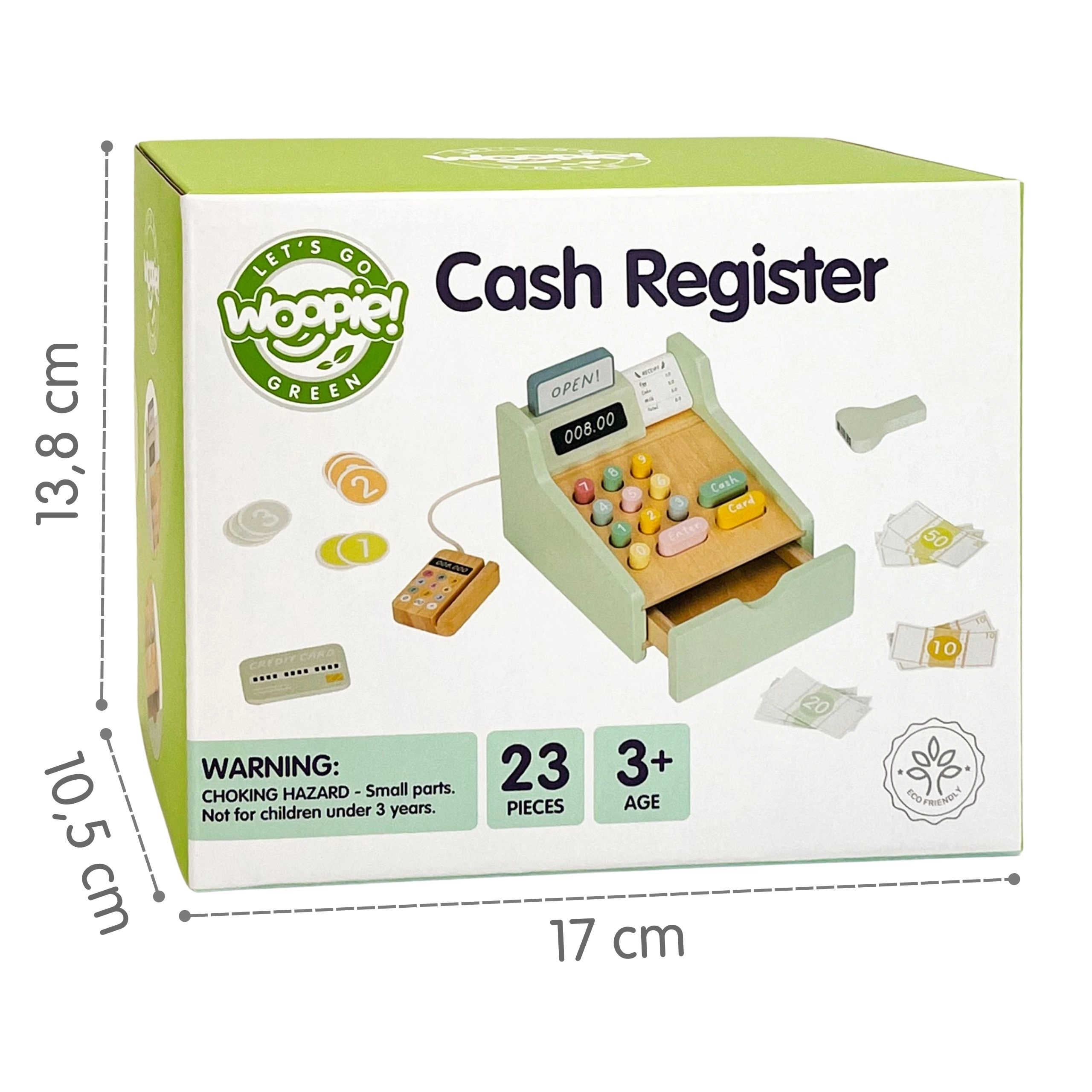 La caisse en bois WOOPIE GREEN est le jouet idéal pour les enfants dès 3 ans qui aiment jouer au magasin, au café ou au restaurant. Grâce à ses éléments fonctionnels comme le tiroir à argent coulissant, le scanner de codes-barres et le lecteur de cartes, les enfants apprennent les bases du paiement et de la gestion de l’argent de manière naturelle et ludique.