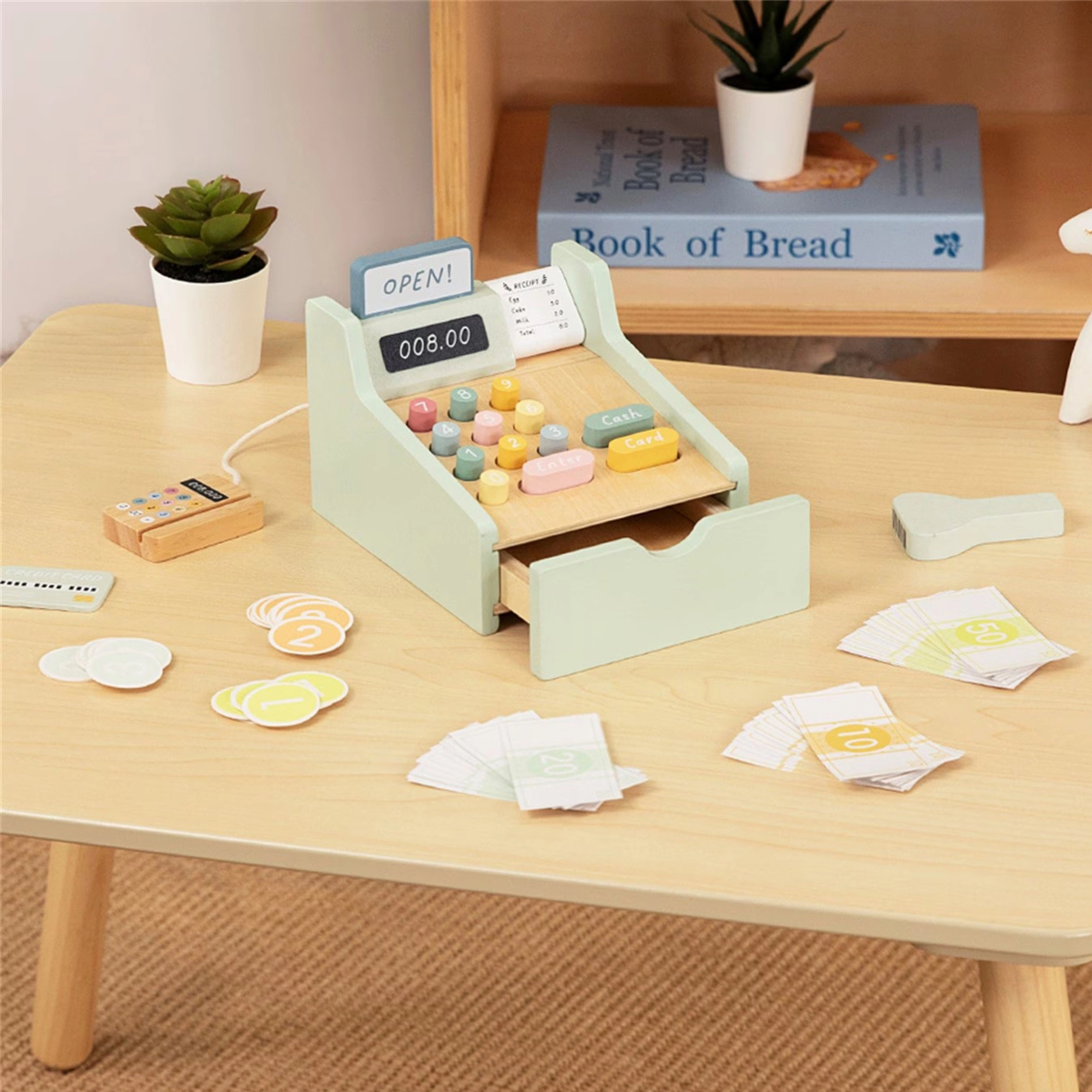 Les enfants adoreront ouvrir le tiroir-caisse, trier les pièces et appuyer sur les boutons bien visibles – un excellent entraînement de la motricité fine et de la coordination.