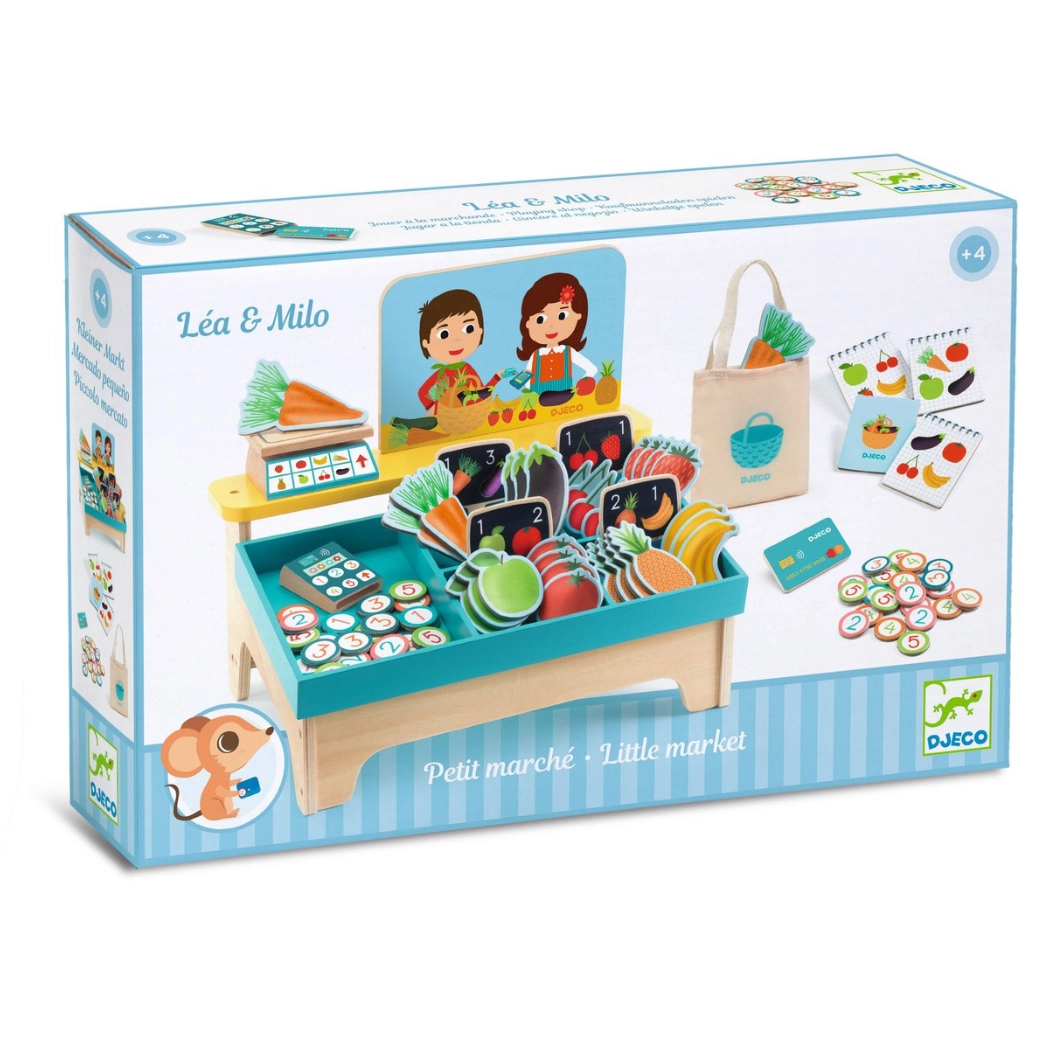 Découvrez la magie du jeu de la marchande avec le magnifique set DJECO petite boutique Léa & Milo. Les enfants peuvent trier, compter et proposer des produits « frais » aux clients, enrichir leur vocabulaire, développer leur motricité fine et vivre l’ambiance réaliste d’un marché.