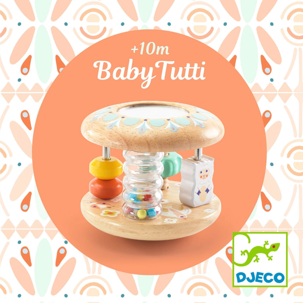 Baby Tutti est un jouet en bois bien pensé, facile à saisir, agréable à secouer et qui roule lorsqu’on le pose. Les enfants seront captivés par le sablier de perles colorées dans le tube transparent, le petit miroir pour les premières découvertes et les anneaux coulissants sur les tiges. Le jouet favorise la coordination œil–main et encourage à ramper et à se retourner.