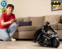 - Contenu de la boîte : moto RC Batcycle, télécommande, figurine Batman 30 cm, notice
