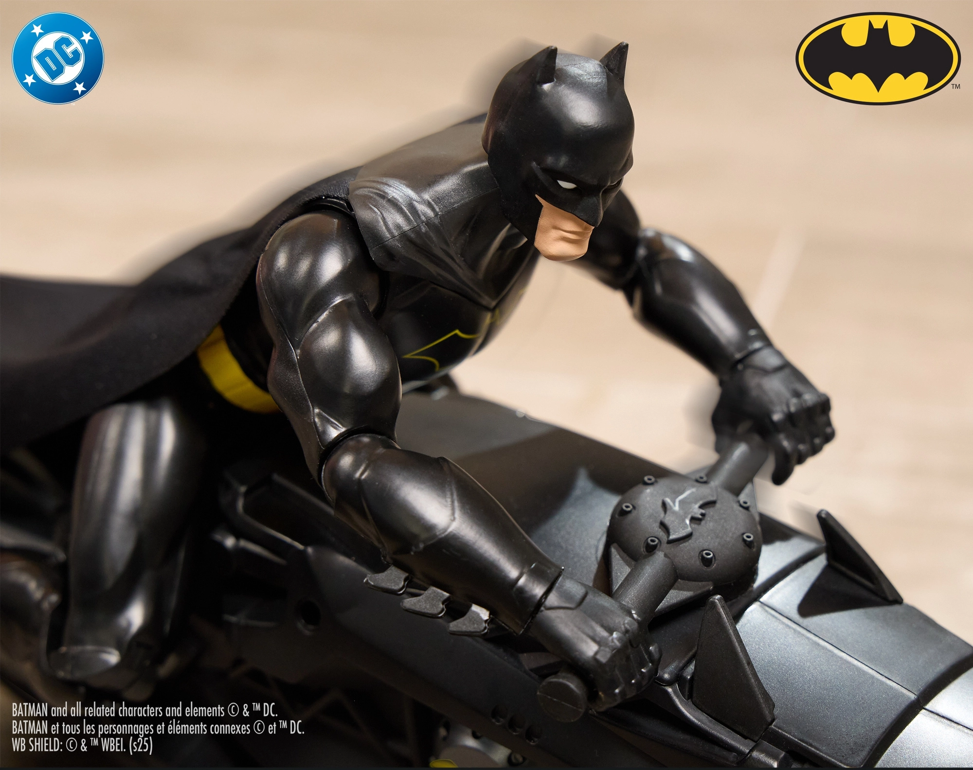 La figurine BATMAN de 30 cm possède une tête, des bras et des jambes mobiles. Asseyez-la facilement sur la moto et placez-la dans des positions héroïques.