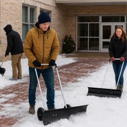 Le chasse-neige manuel à roues est idéal pour nettoyer les trottoirs, les allées et les cours. La poignée bi-mains ergonomique et les deux grandes roues facilitent la poussée fluide de la neige sans levage pénible. La largeur de 95 cm accélère le nettoyage des longues zones et, grâce à une conduite stable, minimise les passages répétés.