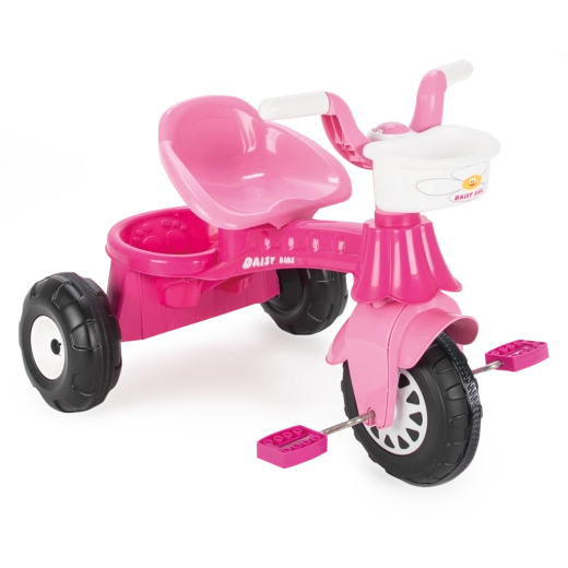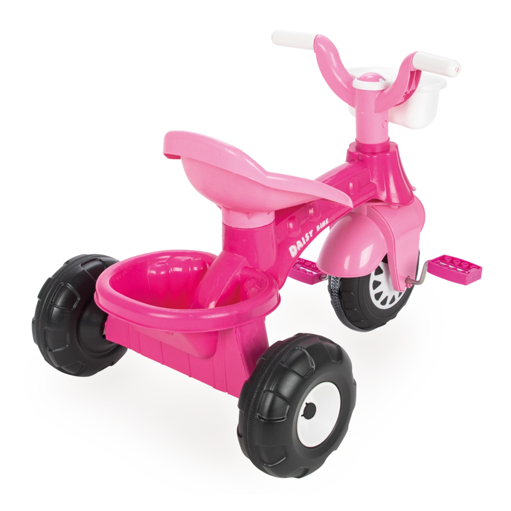 Adorable tricycle pour enfants de couleur rose avec motif de pâquerette DAISY, ravira les petits cyclistes dès environ 3 ans. Construction légère et robuste, roues en plastique robustes pour une conduite stable et deux paniers pour les jouets en font un choix idéal pour les premières sorties. Charge maximale jusqu’à 35 kg.