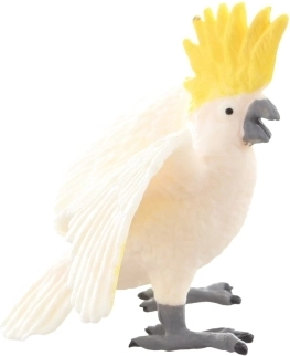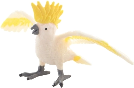 La texture fine du plumage, la huppe jaune et la posture authentique apportent l’apparence réelle du cacatoès dans la chambre d’enfant comme dans une vitrine.