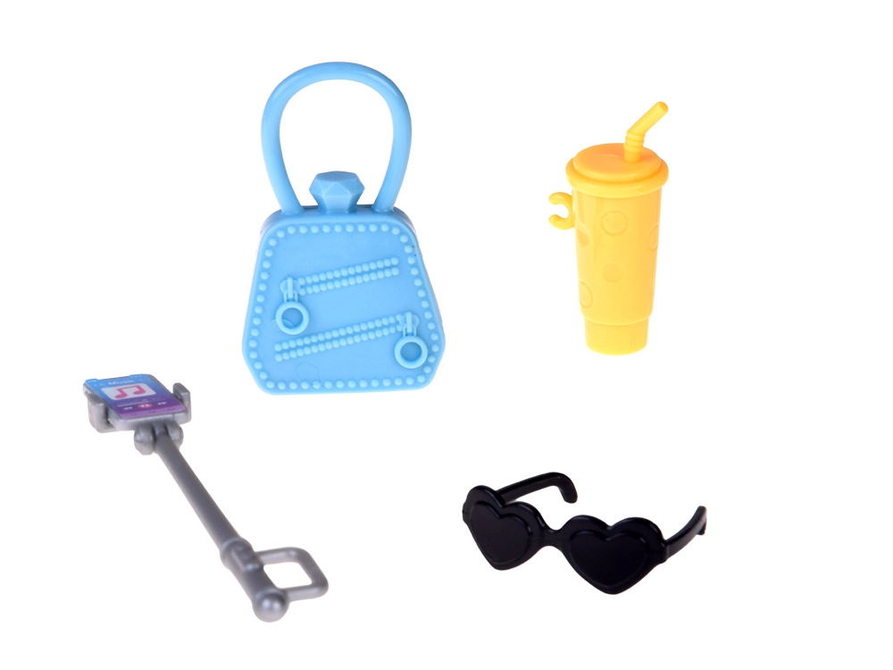Un sac à main, des lunettes en forme de cœur, un gobelet avec boisson et une perche à selfie avec smartphone (factice) élargissent les possibilités de jeu.