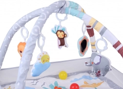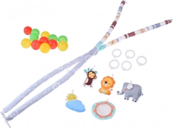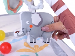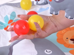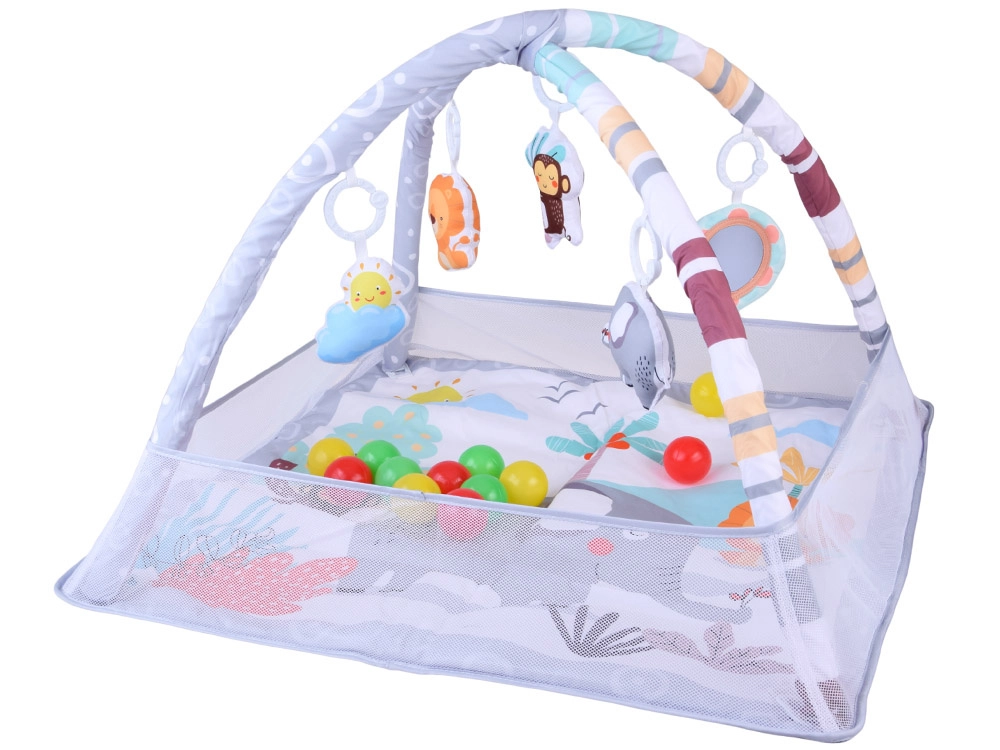 Les animaux en peluche, un soleil avec nuage, un miroir pour bébé et des balles colorées stimulent la vue, le toucher et l’ouïe, tout en motivant à s’étirer, saisir et se retourner.