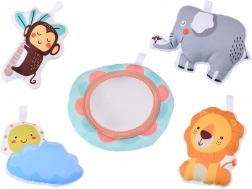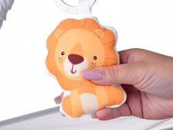 - jouets suspendus incluant miroir, soleil avec nuage et animaux (lion, éléphant, petit singe)