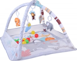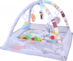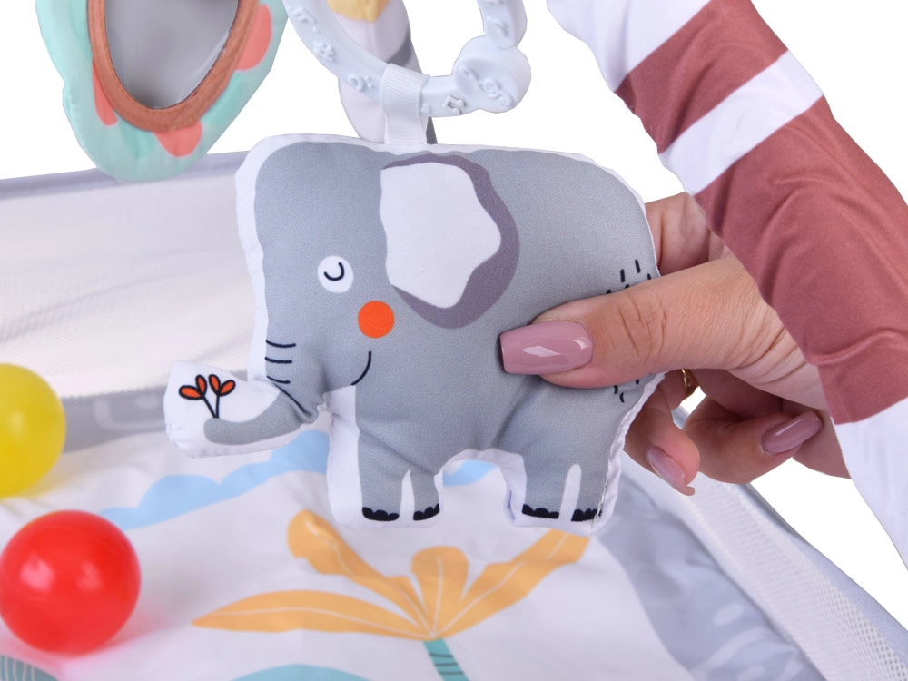 Adorable tapis d’éveil éducatif pour bébés offrant un confort moelleux, un parc sécurisé en maille et deux arches amovibles avec jouets suspendus. Il favorise le développement sensoriel, la motricité fine et globale et encourage le jeu sur le ventre. Des balles en plastique colorées, de petits animaux en peluche et un miroir pour bébé divertissent votre enfant à la maison comme en voyage.