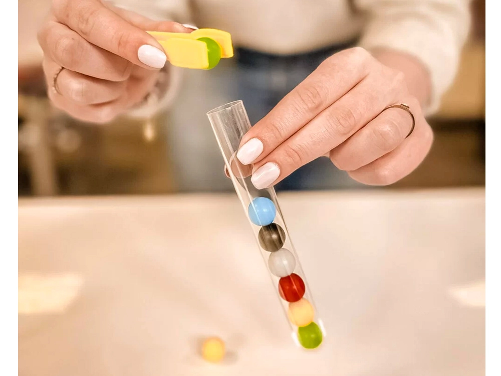 Ce jeu éducatif original, inspiré par la méthode MONTESSORI, favorise l’apprentissage par l’action. Les enfants saisissent les billes colorées avec une pince et les insèrent dans l’éprouvette, soit librement, soit en suivant des cartes modèles. Ils entraînent ainsi la précision des mouvements, la patience et la coordination visuo-motrice.