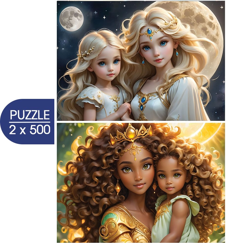 Profitez d’un moment de détente avec un élégant coffret de deux puzzles de 500 pièces chacun, représentant une mère et sa fille inspirées par les symboles de la lune et du soleil. Idéal pour les amoureux d’illustrations artistiques, de finition de qualité et de moments paisibles à la maison.