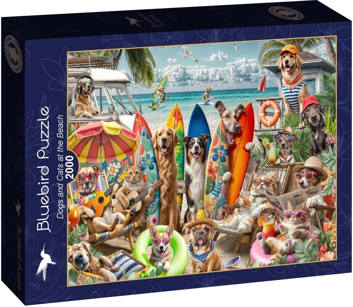 Découvrez une illustration détaillée de chiens et de chats sur la plage qui ravira toute la famille. Le puzzle BLUEBIRD se distingue par une découpe précise et un matériau agréable, grâce auxquels les pièces s’emboîtent parfaitement. L’image finie de 98 × 69 cm est parfaite pour être encadrée et exposée.