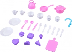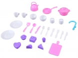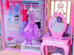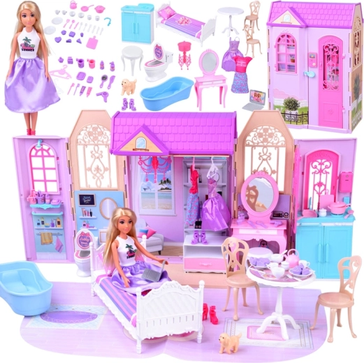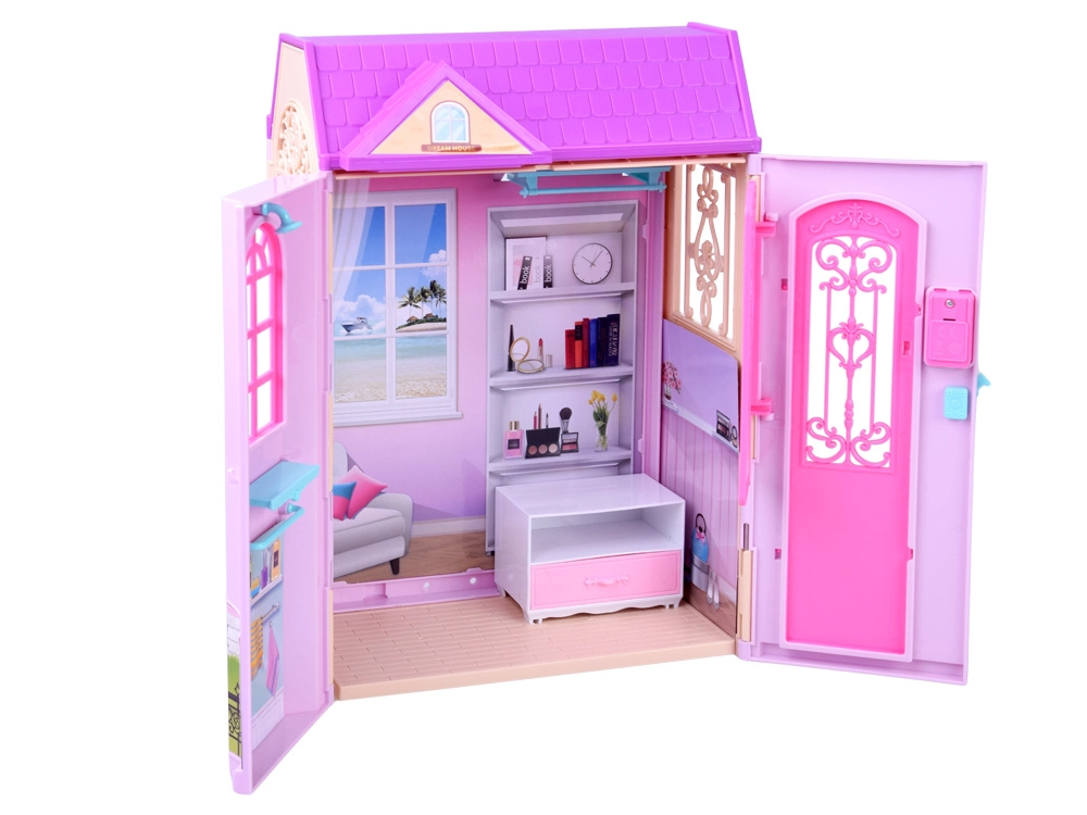 La maison pliable rose‑violette est conçue comme une valisette pratique que les enfants emportent facilement à la crèche, en vacances ou chez des amis. Une fois déployée, elle crée un mini foyer douillet avec trois zones entièrement équipées : une salle de bain pour de longs bains, une chambre avec coiffeuse pour le stylisme et le repos, et une cuisine – le cœur de toute maison.