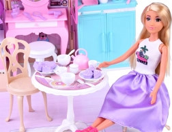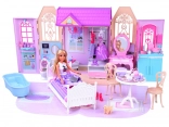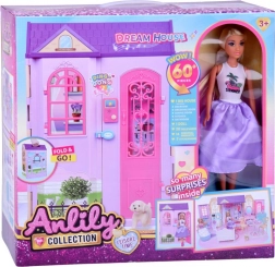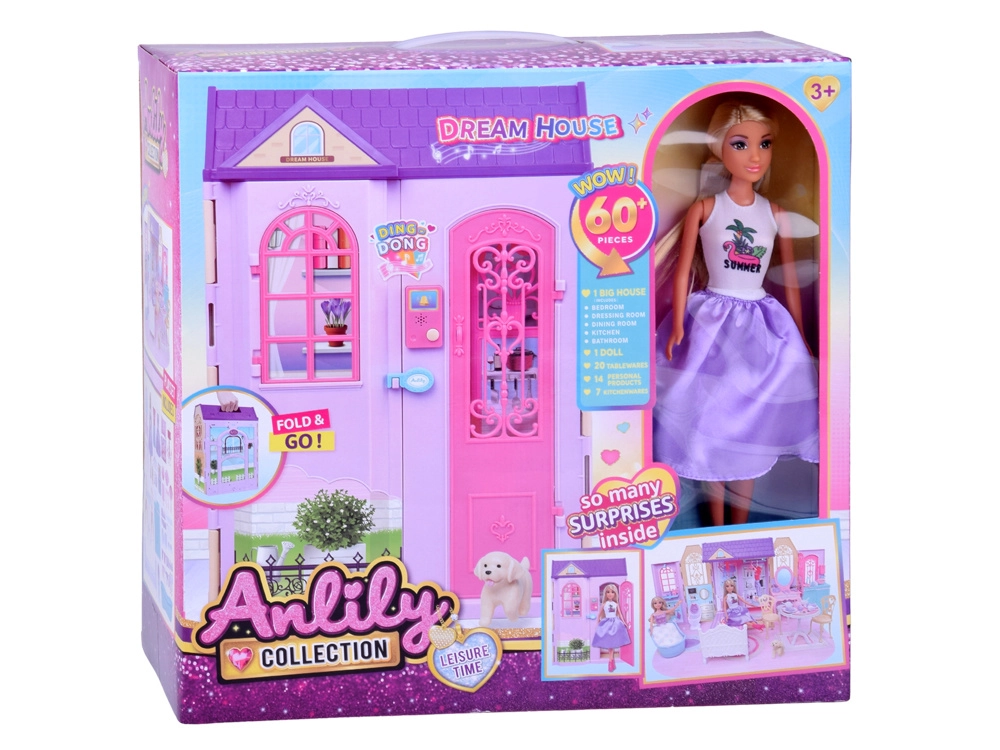 Inclus : une poupée ANLILY aux longs cheveux idéals à coiffer, du mobilier (lit avec parure, armoire à tiroirs, portemanteau, baignoire, WC, coiffeuse avec tabouret, ensemble de salle à manger), équipement de cuisine et de nombreux accessoires pour le soin et la cuisine. Portes et fenêtres ouvrantes, décorations et sonnette à piles favorisent un jeu de rôle réaliste.