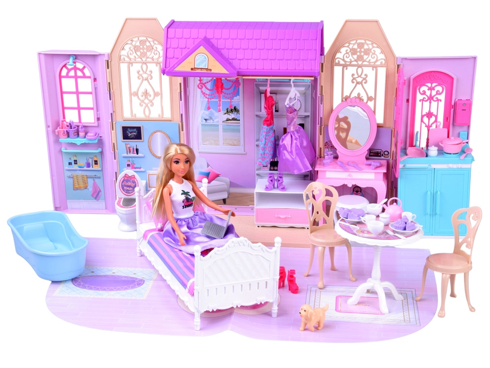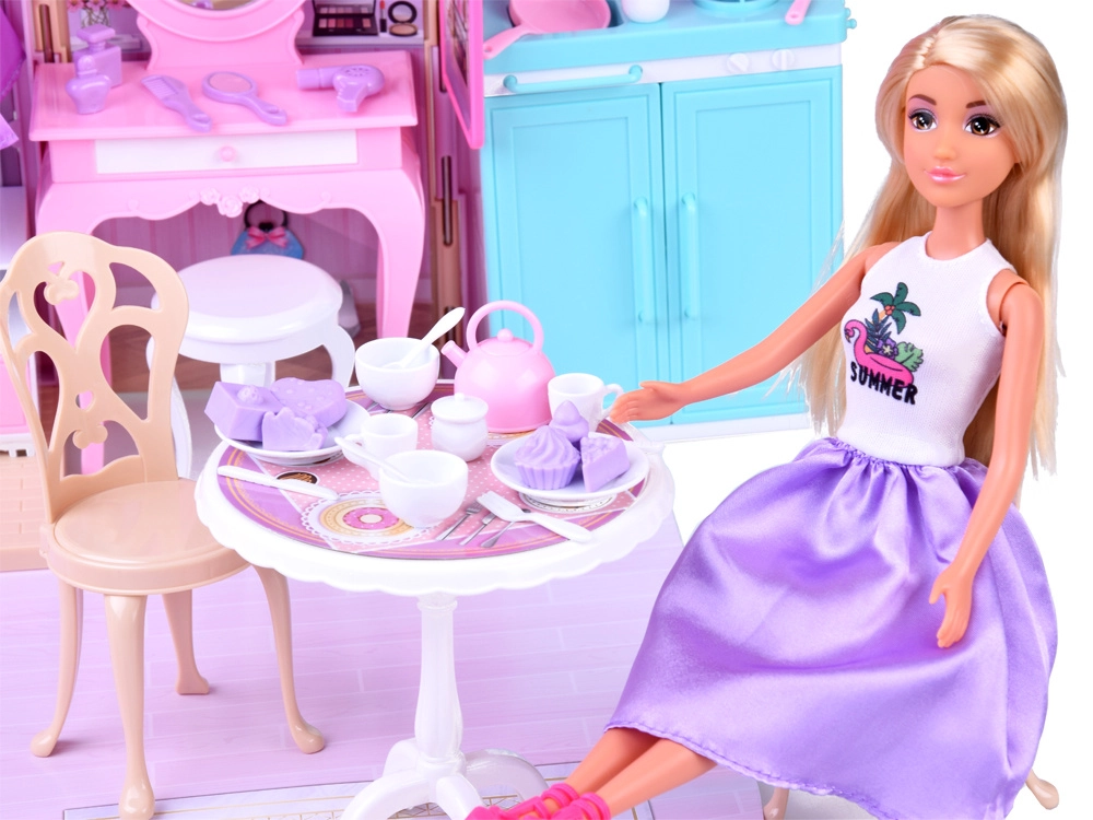 La salle de bain, la chambre avec coiffeuse et la cuisine composent une maison complète pour la poupée. Les portes et fenêtres ouvrantes ainsi que les décorations détaillées stimulent l’imagination et le jeu réaliste.
