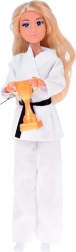 Kimono blanc avec ceinture noire et trophée doré pour la gagnante. Grâce à ses bras articulés, la poupée réussit aussi bien les poses de combat que la célébration de la victoire.