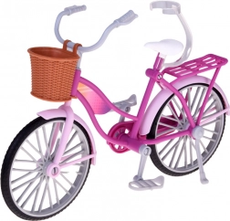 Le vélo rose‑violet avec panier avant, porte‑bagages arrière, pédales et roues à bâtons roule librement et se manie aisément. La selle avec support maintient la poupée de façon stable pendant la « conduite ».