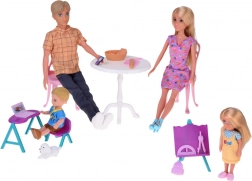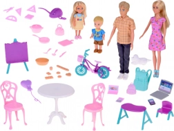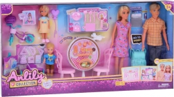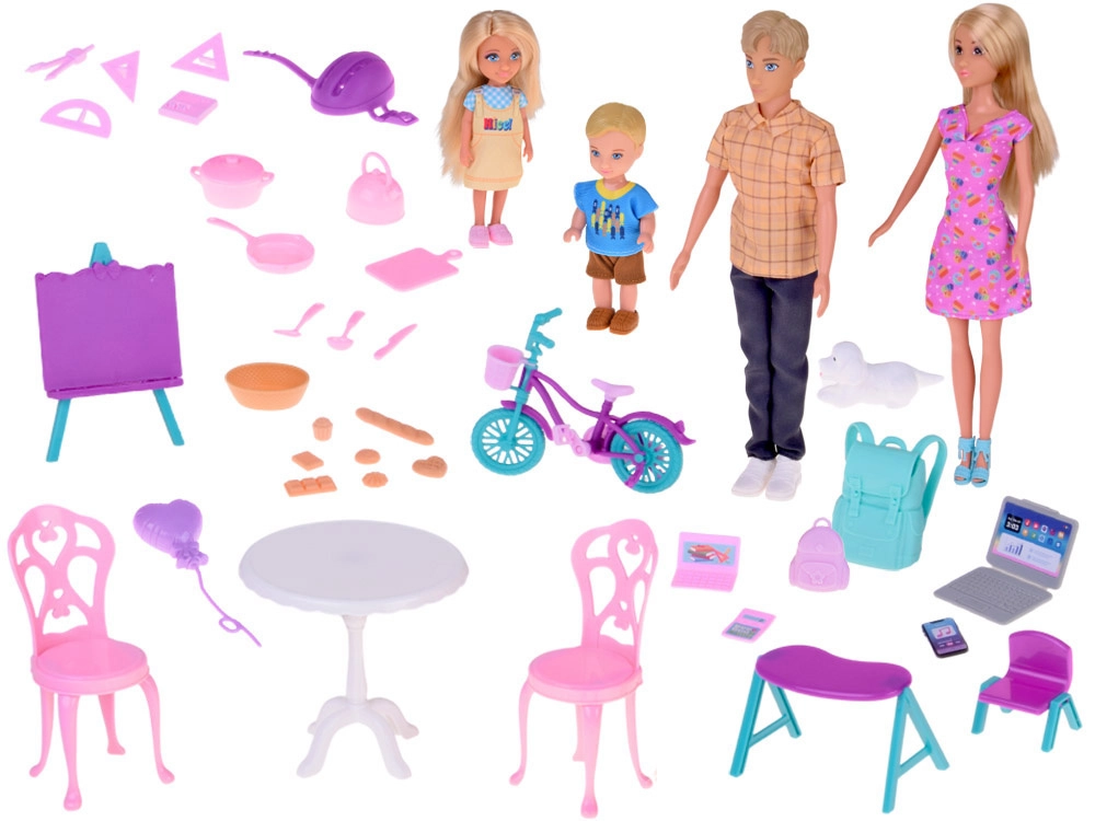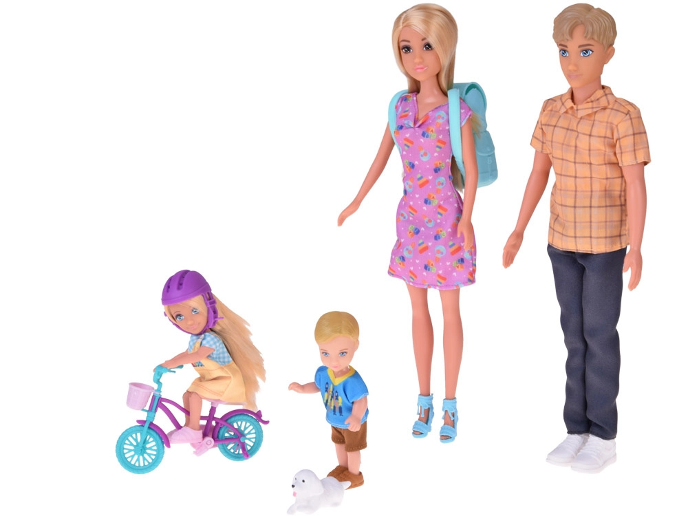 Quatre poupées avec des tenues détaillées et des articulations mobiles permettent aux enfants de rejouer les situations du quotidien, du petit-déjeuner jusqu’à la détente du soir. Un adorable petit chien est également inclus.