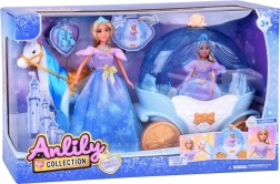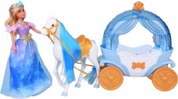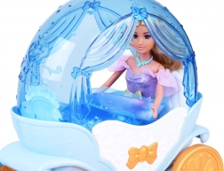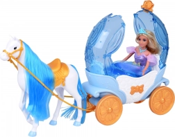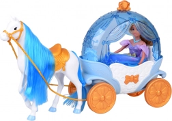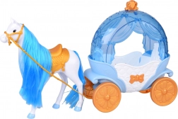 Le carrosse « citrouille » bleu‑blanc avec des accents dorés possède une partie supérieure ouvrante, ce qui permet d’y installer la poupée facilement. Le cheval blanc à crinière bleue est équipé d’une selle, d’une bride et d’un harnais, et le carrosse a des roues mobiles pour rouler en douceur sur le sol.